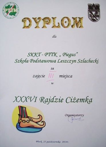 W dniu 25 października uczniowie SKKT PTTK „Piegus" wzięli udział w XXXVI rajdzie „Ciżemka 2014”, który zorganizowany był przez SKKT PTTK Małachowiacy. Przy niezbyt sprzyjającej pogodzie o godzinie 10.00 zaliczyliśmy pierwsze zadanie - zdjęcie na płockim molo. Kolejne zadania to m.in. pierwsze dania z karty menu restauracji Wieża Ciśnień, adres nowej siedziby policji w Płocku.