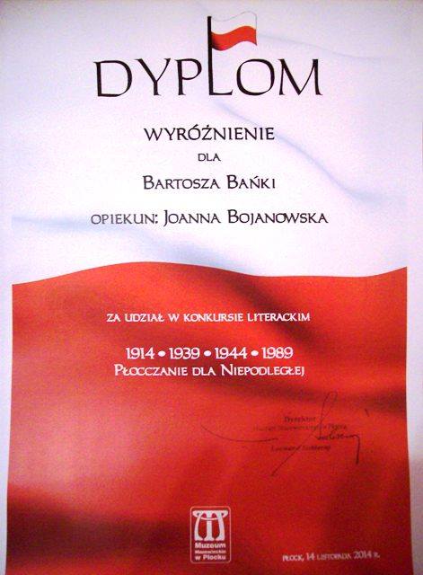 Bartosz Bańka uczeń kl. VI otrzymał wyróżnienie w konkursie literackim
