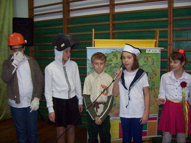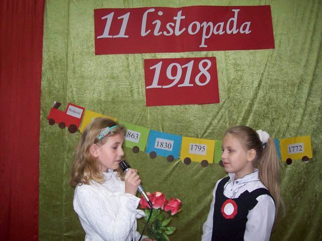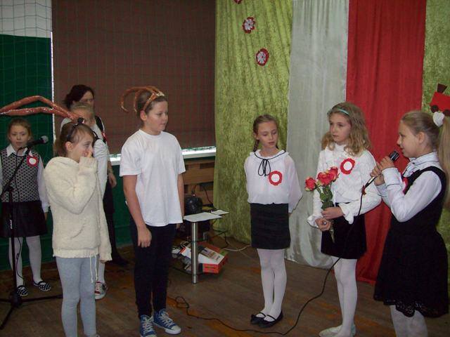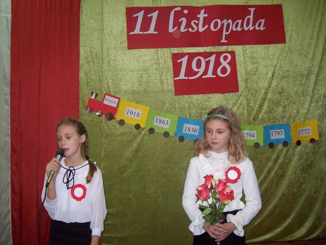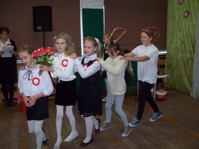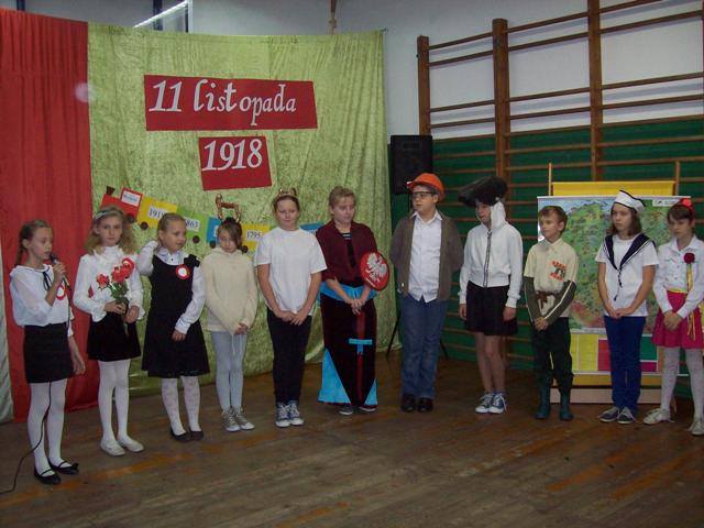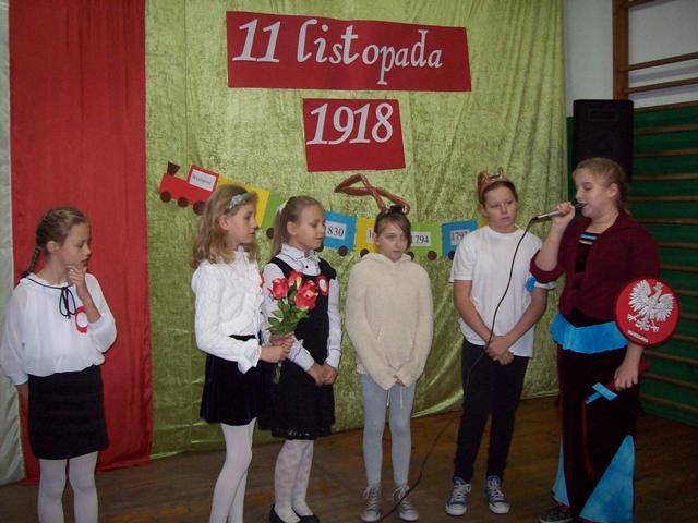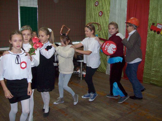 W czasie szkolnej akademii młodzi aktorzy zastanawiali się komu złożyc życzenia z okazji urodzin naszej Polski. Podróżując pociągiem odwiedzili ważne miejsca- Poznań, Warszawę, Szczecin, Rzeszów. Spotkali osoby, które reprezentują różne zawody. Pod koniec wędrówki wycieczkowicze doszli do wniosku, że to jest wspólne święto wszystkich Polaków - od Bałtyku po Karpaty. „Przecież Polska to my właśnie- jedni drugim dajmy kwiaty.” Później wspólnie zaśpiewaliśmy : „Legiony”, „Rozkwitają pąki białych róż”, „Przybyli ułani”. Następnie zostały ogłoszone wyniki konkursu plastycznego –„Godło polskie na przestrzeni wieków” dla klas 0-III, zaś dla uczniów kl. IV-VI był przeprowadzony konkurs sprawdzający znajomośc hymnu. Zwycięzcy otrzymali dyplomy i upominki.