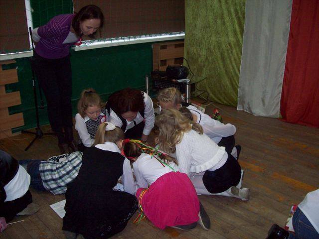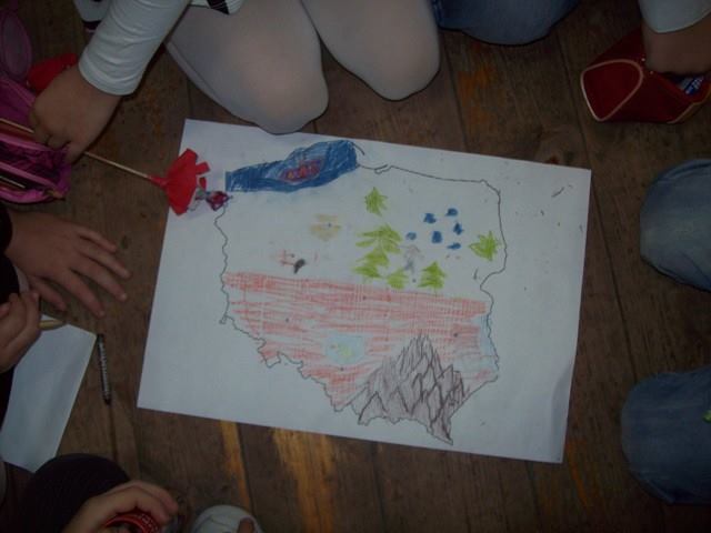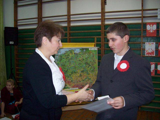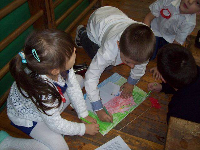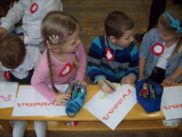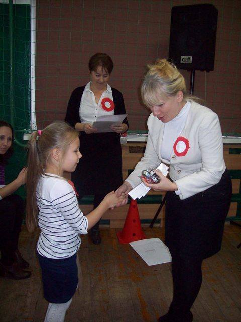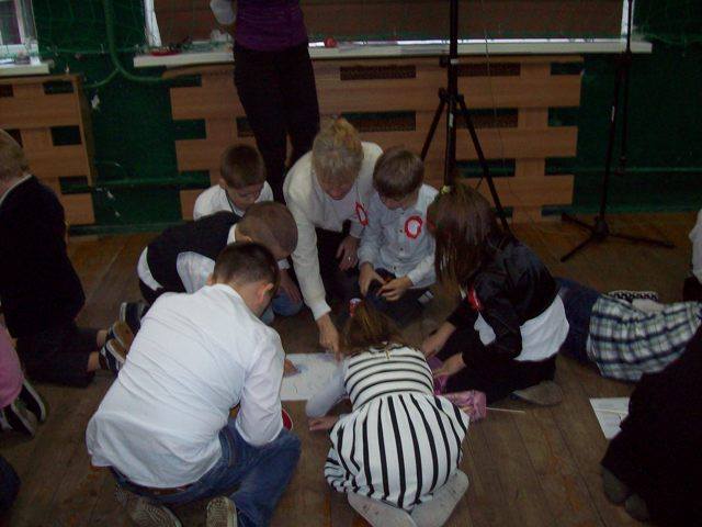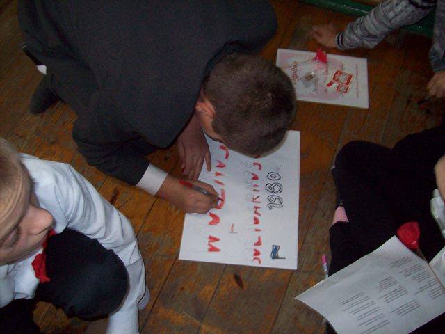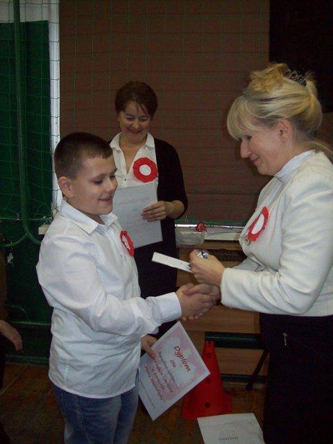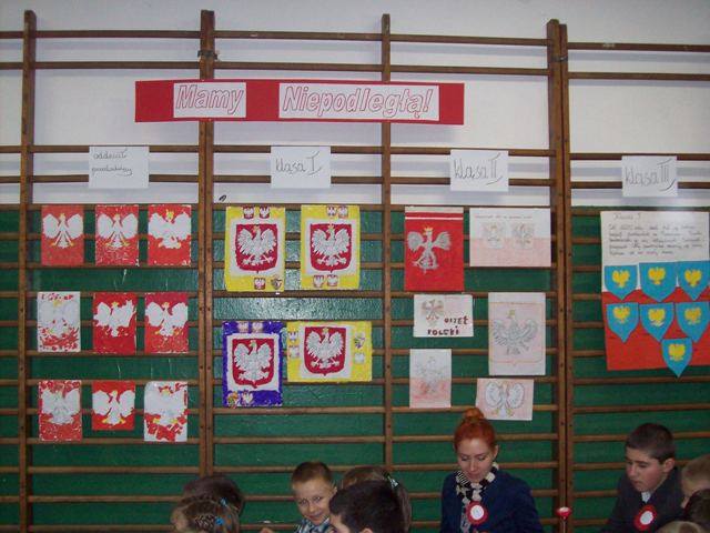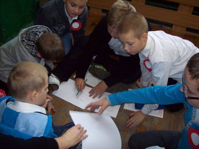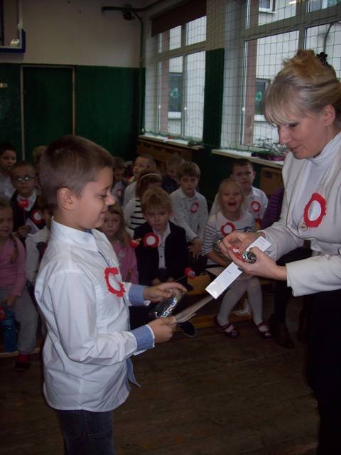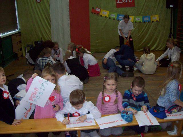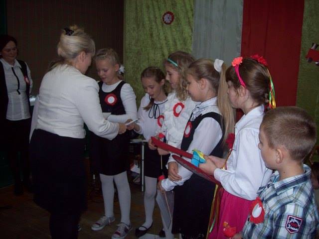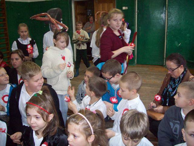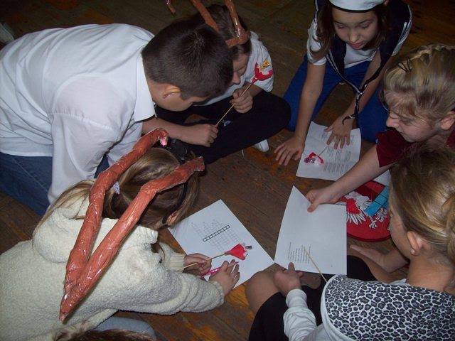 Na zakończenie każda klasa miała do wykonania zadanie związane z historią naszej Ojczyzny. Dla młodszych były to kolorowanki, a starsi rozwiązywali krzyżówki i przygotowywali plakat. Wszyscy uczestnicy wspólnego świętowania Niepodległości otrzymali kwiatek biało-czerwony z cukierkiem.