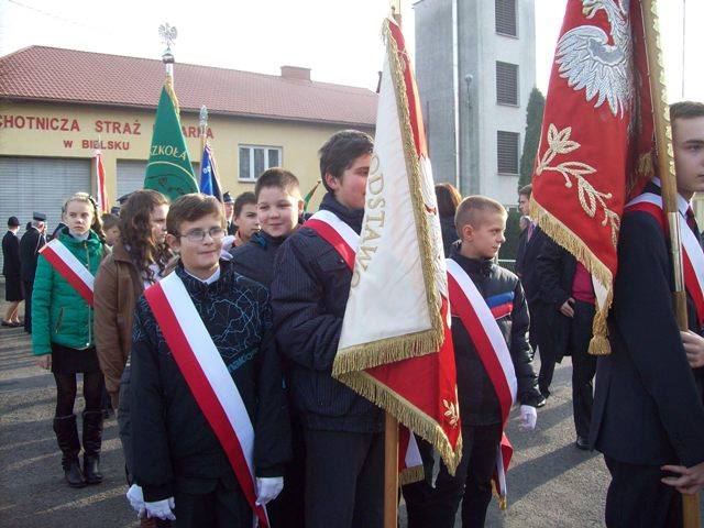 Świętowanie rozpoczęliśmy kilka dni wcześniej. Uczniowie wysłali do przyjaciół i znajomych kartki z napisem „Mamy Niepodległą ” wydane przez Muzeum Józefa Piłsudskiego w Sulejówku. 08.11.2014r. szkolny chór uczestniczył w konkursie „Pieśni patriotycznej i legionowej” zorganizowanym przez OM PTTK w Płocku, natomiast 11.11.2014 poczet sztandarowy uczniów reprezentował szkołę w czasie gminnych obchodów Święta Niepodległości w Bielsku.