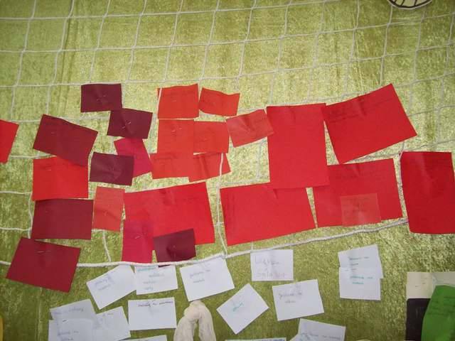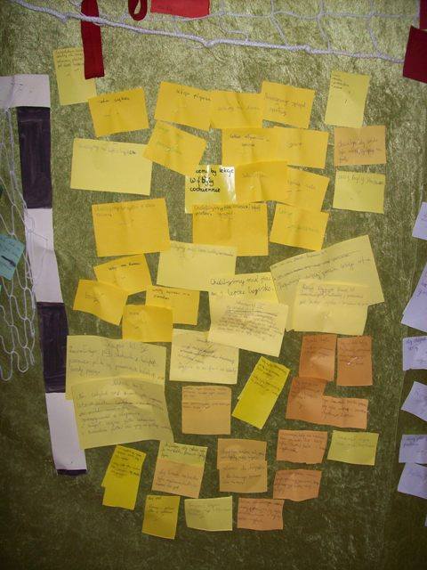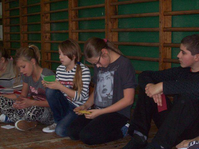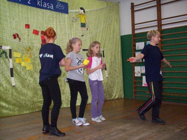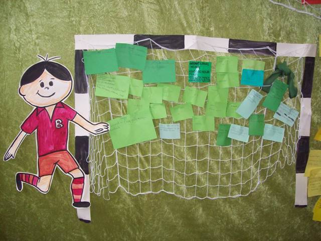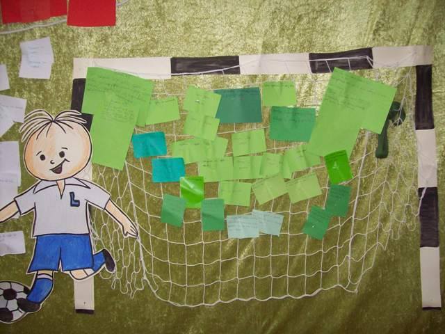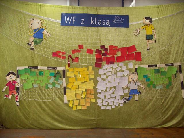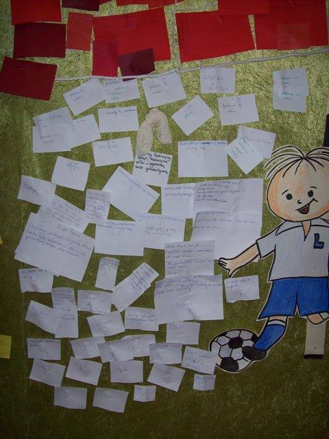 Na karteczkach w kolorze czerwonym zapisali odpowiedzi na pierwsze pytanie – „Czego nie lubisz w lekcji wf?” Po odczytaniu karteczki zostały przypięte na rozciągniętej siatce od siatkówki. Na zielonych karteczkach zapisali odpowiedzi na drugie pytanie –„Co lubisz w lekcji wf?” Karteczki zostały przypięte w bramkach. Odpowiedzi na pytanie „Co byś zmienił?” zapisali na żółtych kartkach, które przypięliśmy na jednej z połówek boiska. Na drugiej połówce znalazły się białe karteczki z odpowiedziami na 4 pytanie „Propozycje udoskonalenia lekcji wf”. W ten sposób powstało nam kolorowe boisko do gry w siatkówkę i piłkę nożną.