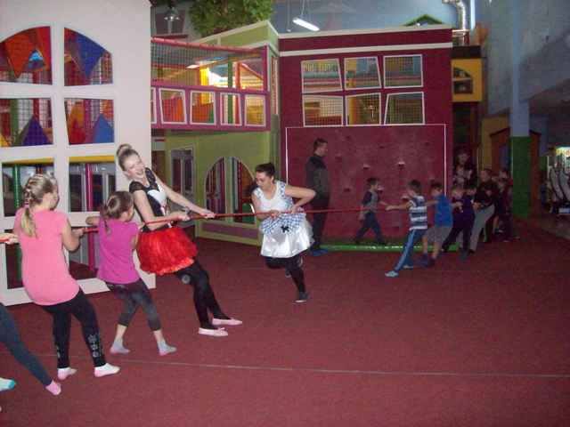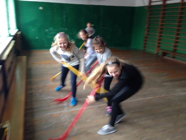 Wtorek i środa obfitowały w największe atrakcje. Były to dni pełne gier i zabaw. Dzieciaki szalały na szkolnym parkiecie grając w dwa ognie, koszykówkę, tenisa stołowego oraz w hokeja. Ta ostatnia gra sprawiała im wiele radości i niesamowitą frajdę, ponieważ grały po raz pierwszy niedawno zakupionym sprzętem do mini hokeja. Żeby zregenerować siły przed kolejnymi atrakcjami malowały zimę, której brakowało podczas ferii. Kolejnym niesamowitym przeżyciem był wyjazd za własne zaoszczędzone pieniądze do Happy Parku w Stróżewku. Tam w pełni mogli wykorzystać swoje pokłady niespożytej energii podczas przeciągania liny, na wspinaczki, przechodzenia pod nisko zawieszonym sznurkiem czy też w tańcu „Ługi Bugi dla papugi.” W czwartek i piątek odbyły się zajęcia ogólnorozwojowe na sali gimnastycznej oraz w świetlicy. Były nawet próby ulepienia bałwana z niewielkiej ilości śniegu.