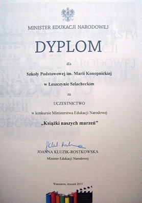 W grudniu 2014 roku uczniowie naszej szkoły przystąpili do konkursu „Książki naszych marzeń”, który był organizowany przez Ministerstwo Edukacji Narodowej. Uczniowie wytypowali utwory, o przeczytaniu których marzą. Tak została stworzona lista zawierająca 38 tytułów. Najczęściej są to pozycje z kanonu lektur szkolnych. Ponadto uczniowie klasy V nagrali film na temat „Nasza szkoła powinna dostac wymarzone książki, bo…”.