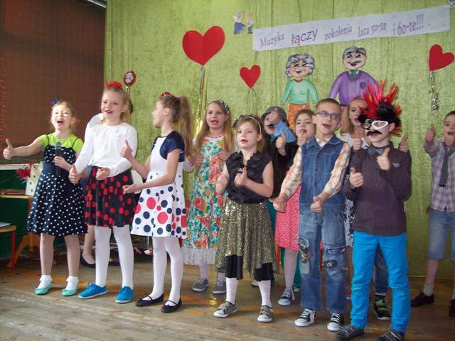 „Muzyka łączy pokolenia.”. Potwierdzeniem tego hasła była wspólna zabawa zorganizowana 13.02.2015 w naszej szkole. Świętowaliśmy Dzień Babci i Dziadka połączony z balem karnawałowym. Na początku spotkania uczniowie przedstawili humorystyczne scenki z życia pewnych dziadków. Poza tym były piosenki i występ taneczny dla wyjątkowych gości. Babcie i dziadkowie ze wzruszeniem słuchali występów swoich wnucząt. Mogli również odnaleźć się na portretach, które wcześniej wykonali uczniowie. Później rozpoczęła się wspólna zabawa. Dzieci tańczyły z babciami i dziadkami, którzy licznie brali udział w wielu konkursach (tanecznych, sprawnościowych), zdobywali dyplomy i odznaczenia….Oj działo się działo….W strojach dominowały „kropki, grochy i groszki”, ponieważ świętowaliśmy lata pięćdziesiąte i sześćdziesiąte …, ale muzyka na parkiecie była z różnych epok. Wspólna zabawa, taneczna atmosfera udzieliła się wszystkim zabawowiczom, integrowali się najmłodsi i najstarsi.