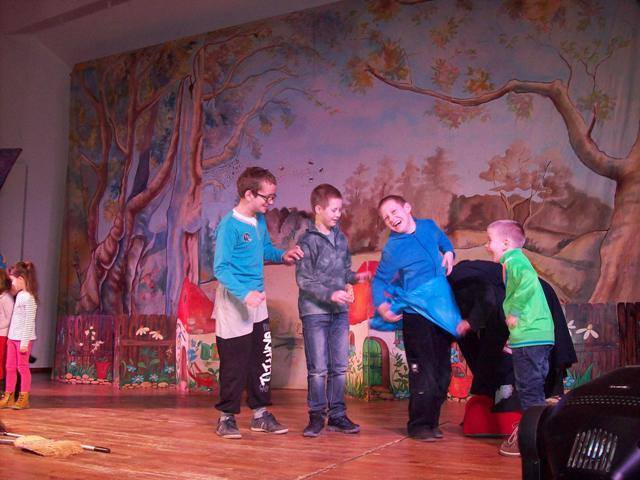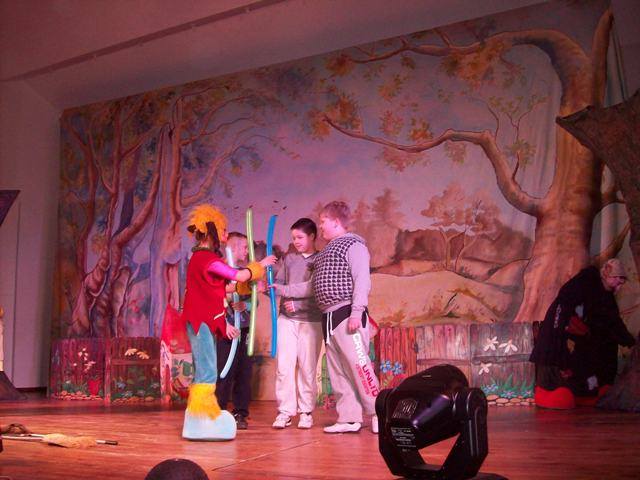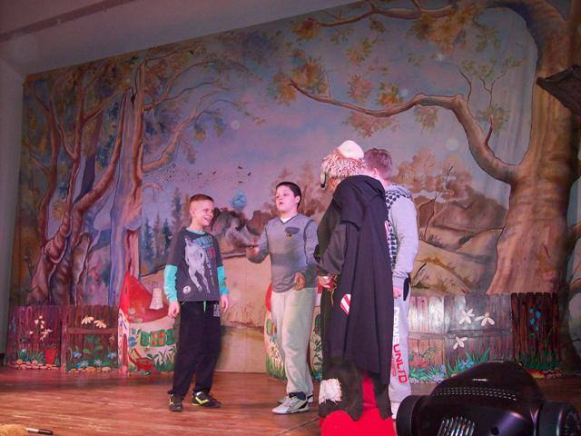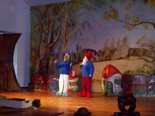 powitały nas zajączki, które były naszym przewodnikiem po świecie krasnali. W bajkowej krainie spotkali się z nami: Gargamel, Smerfy, Czarodziejka Agata, Krasnal Dobrodziej. Przedstawienie wzbogacone było o piosenki śpiewane przez bohaterów spektaklu.