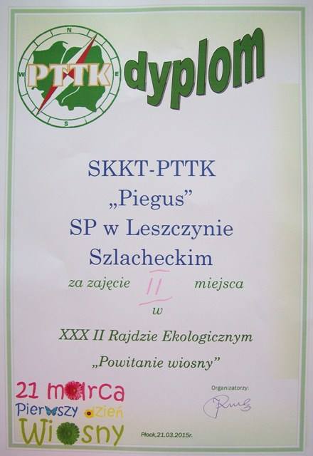 21 marca 2015r. uczniowie SKKT PTTK „Piegus” wyruszyli na trasę XXXII Rajdu „Powitanie Wiosny”. Drużynowo „Piegusy” zajęły II miejsce.