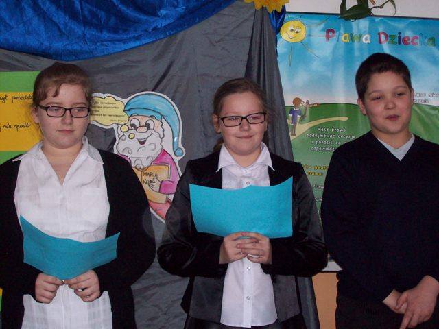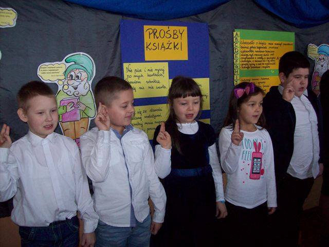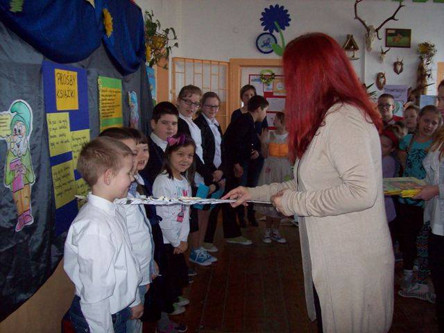 Tym razem przyrzekali książce szacunek i przestrzeganie obowiązków czytelnika. Zanim jednak zostali pasowani - wysłuchali próśb książek oraz abecadła wyjaśniającego bogactwo biblioteki. Musieli również udowodnić znajomość bajek. Królowa „Książka” skrupulatnie ich przeegzaminowała. Po udanych testach dostąpili zaszczytnego wyróżnienia. Dyrektor szkoły p. J. Bojanowska niezwykłym piórem dokonała ceremonii pasowania na czytelnika szkolnej biblioteki. Następnie pierwszoklasiści zaśpiewali piosenkę i dokonali wpisu do pamiątkowej księgi czytelników szkolnej biblioteki. Najmłodsi czytelnicy otrzymali pamiątkowe dyplomy oraz książeczki autorstwa patrona naszej szkoły – Marii Konopnickiej. Od dziś zaczynają swoją przygodę z książką i na pewno się wielokrotnie przekonają, że ….książki nigdy nie zawiodą, a w życiu czasem pomogą”.