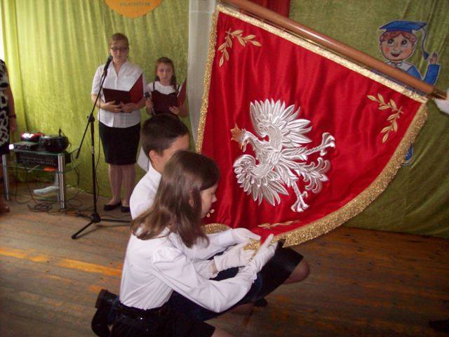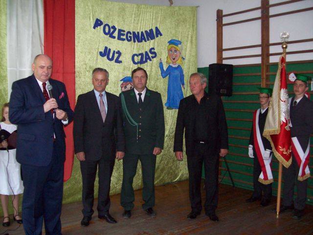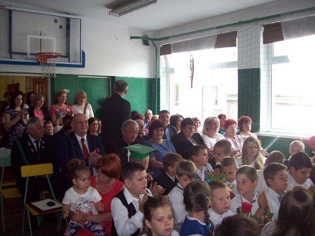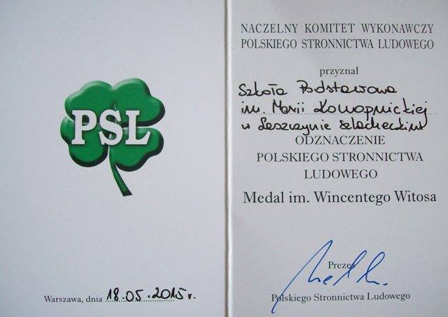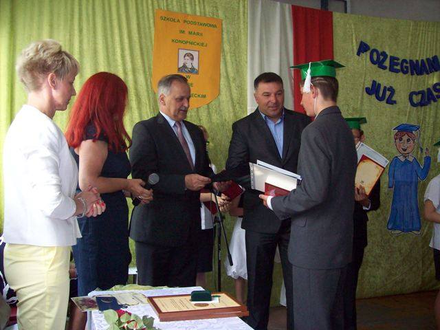 W czasie uroczystości nastąpiło dla całej szkolnej społeczności wyjątkowe wyróżnienie. Z rąk Posła na Sejm RP VII kadencji p. Piotra Zgorzelskiego, Przewodniczącego Komisji Samorządu Terytorialnego i Polityki Regionalnej otrzymaliśmy dwie nagrody. Pierwszą nagrodę otrzymała dyrektor szkoły p. J .Bojanowska: Dyplom uznania nadany wraz z odznaczeniem „Złota Koniczynka”, drugie wyróżnienie przeznaczone dla szkoły to: Dyplom uznania nadany wraz z medalem im. Wincentego Witosa z okazji 120 lat istnienia ruchu ludowego na ziemiach polskich. W uzasadnieniu nagrody czytamy: „Za dotychczasową działalność, krzewienie i podtrzymywanie tradycji ruchu ludowego zapoczątkowaną przez patronkę szkoły – Marię Konopnicką, autorkę „Roty”- hymnu ruchu ludowego.” Dyrektor Szkoły p. J. Bojanowska dziękując za to podwójne wyróżnienie podkreśliła, „że jest wyjątkowe , ponieważ otrzymaliśmy je w szczególnym roku jubileuszowym (50-lecia Szkoły). Dodała, że patronka naszej szkoły wybitna pieśniarka, poetka czerpała natchnienie z polskiej przyrody, obyczajów i tradycji ludowej. Podarowała nam i przyszłym pokoleniom „Rotę”. „Nie rzucim ziemi skąd nasz ród” - to słowa, które w każdym z nas wzbudzają poczucie dumy i tożsamości narodowej. Patriotyzm, siła tradycji i wierność zasadom to wartości, które wpajamy naszym wychowankom. W codziennej pracy wychowawczej pamiętamy myśl W. Witosa „Polski nie jest w stanie zbawić pojedynczy człowiek, nawet geniusz, ale może to uczynić cały świadomy swoich praw i obowiązków naród” . Wszyscy zebrani na akademii zaśpiewali „Rotę”. Następnie przedszkolaki oraz uczniowie klasy III zaprezentowali część artystyczną. Na zakończenie pedagodzy, pracownicy szkoły otrzymali kwiaty, zaś goście i zarazem przyjaciele naszej szkoły podziękowania za wsparcie i pomoc w wielu szkolnych przedsięwzięciach.