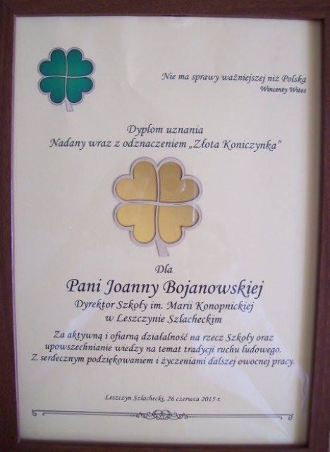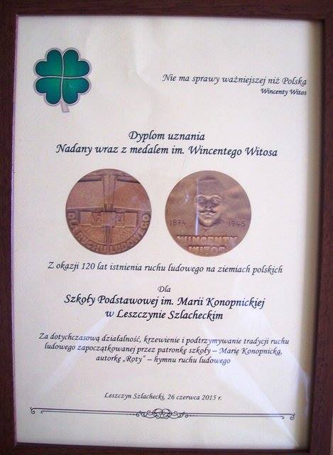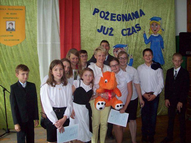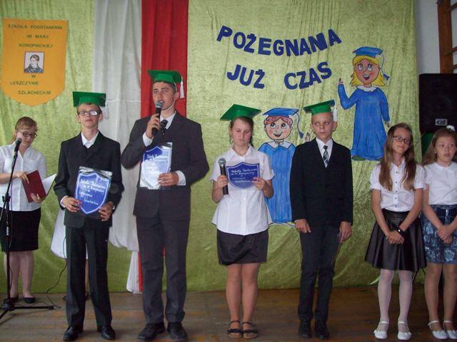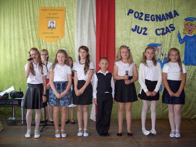 26 czerwca 2015 roku w Szkole Podstawowej im. M. Konopnickiej w Leszczynie Szlacheckim odbyła się uroczysta akademia z okazji zakończenia roku szkolnego 2014/2015 - dzień podsumowań, wręczania świadectw i nagród. Przybyli uczniowie, rodzice, przyjaciele i goście: Wójt Gminy Bielsk p. J. J. Rozkosz, proboszcz parafii Zagroba ks. W. Piątek, radny gminy Bielsk, p. J. Grzelak, p. K. Dydyna. Z Koła Łowickiego „Kniaź”, panie sołtys wsi: Leszczyn Szlachecki - p. J. Dobosz, Józinek- H. Lemanowicz, Leszczyn Księży - p. H. Pomorska, radny powiatu płockiego ziemskiego i prezes Koła Łowieckiego „Kniaź” p. B. Jankowski, emerytowani nauczyciele: p. J. Żółtowska, p. L. Rychlik oraz p. W. Woźniak. Uczniowie klasy VI zostali absolwentami i pożegnali się z nami. Nagrodę Dyrektora Szkoły za najwyższy wynik na sprawdzianie szóstoklasisty oraz Nagrodę Wójta Gminy Bielsk otrzymał Bartosz Bańka. Promocję z wyróżnieniem otrzymali: Karolina Okraszewska i Bartłomiej Romanowski, uczniowie kl V.