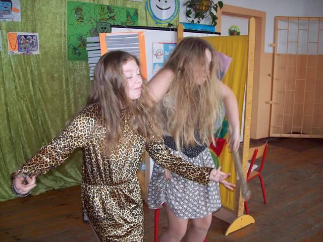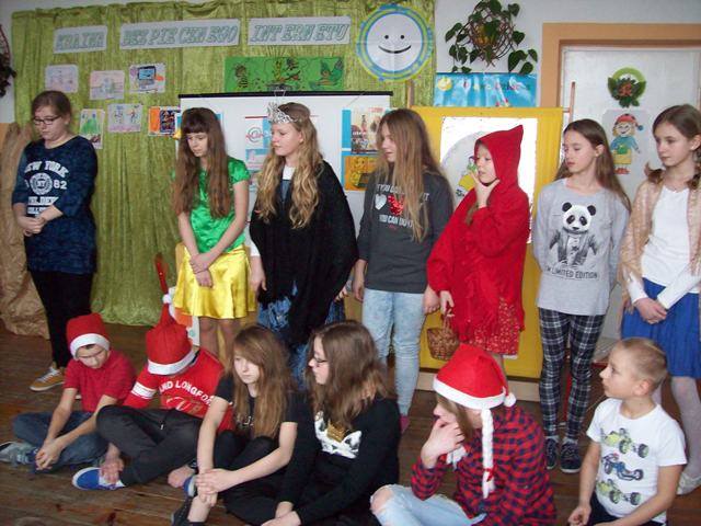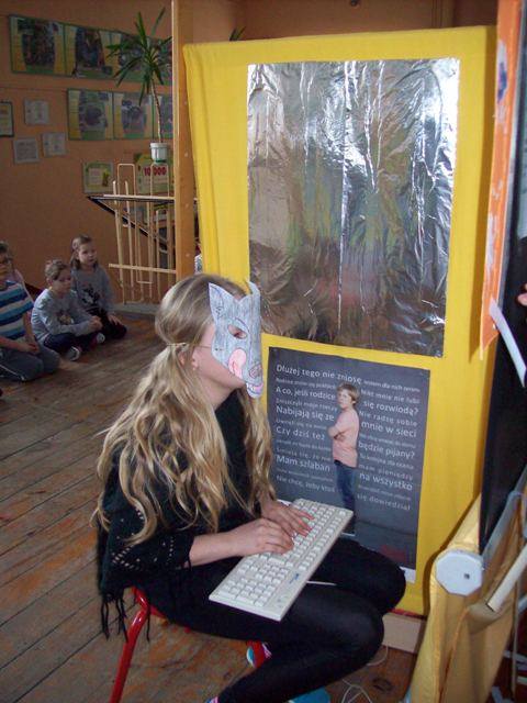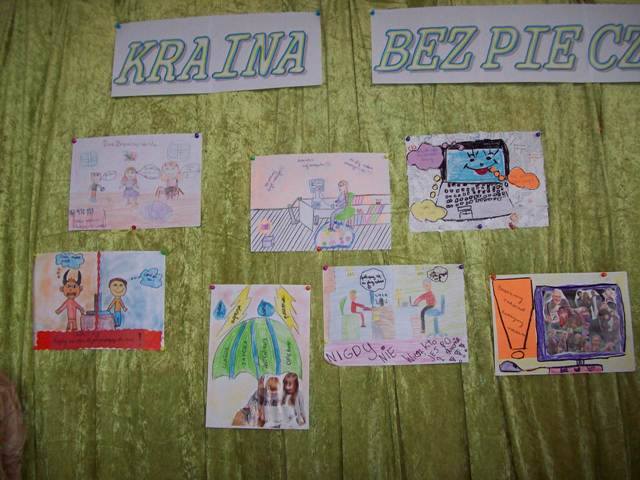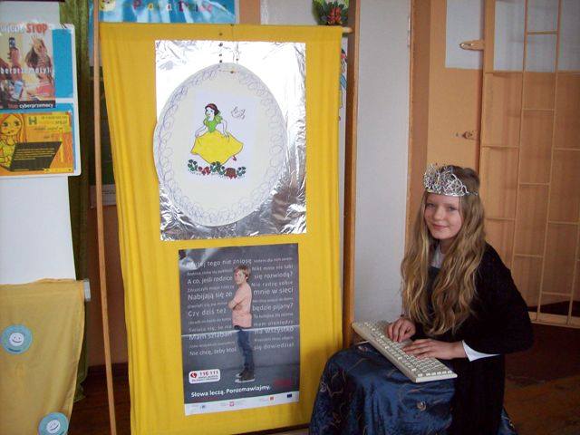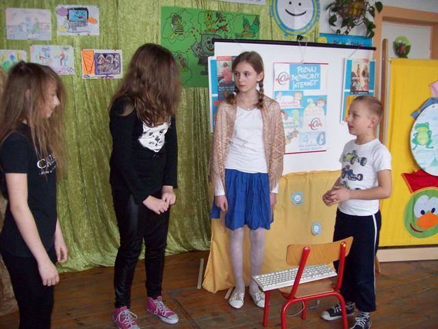 Podsumowaniem wszystkich działań było bajkowe przedstawienie pt. ”Kraina bezpiecznego Internetu” w wykonaniu uczniów kl. IV i VI. Babcia, w którą wcieliła się Klaudia Kaim uczennica kl. VI opowiadała swoim wnukom bajki. Pierwszą z nich była bajka o Czerwonym Kapturku (Wiktoria Drążewska), który szukał przyjaźni w Internecie, rozmawiał z nieznajomymi, nie wiedząc, że po drugiej stronie był straszny Wilk (Patrycja Barucha/Oliwia Trzcińska). Drugą scenką była bajka o Jasiu (Kacper Multon) i Małgosi (Natalia Winnicka), którzy przeglądając nieodpowiednie strony internetowe zainfekowali swój komputer wirusami, ponieważ nie mieli odpowiednich zabezpieczeń m.in. firewalla, programu antywirusowego. W rolę wirusów wcieliła się Karolina Okraszewska oraz Natalia Kowalska. Ostatnią scenką była bajka o Królewnie Śnieżce (Julia Jankowska) i złej Królowej (Oliwia Trzcińska), która chciała ośmieszyć Śnieżkę. Ukradkiem zrobiła kilka zdjęć księżniczce, obrobiła je w programie graficznym i umieściła na portalu społecznościowym. Na szczęście Śnieżce pomogły Krasnoludki (Joanna Jasińska, Sebastian Majcher, Dawid Wiśniewski), które opowiedziały jak walczyć z cyberprzemocą.