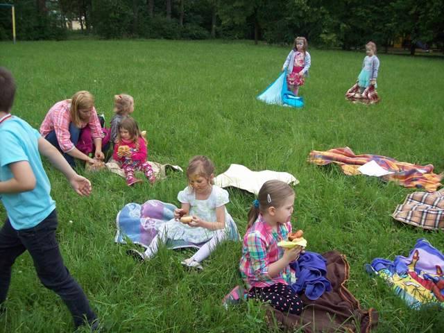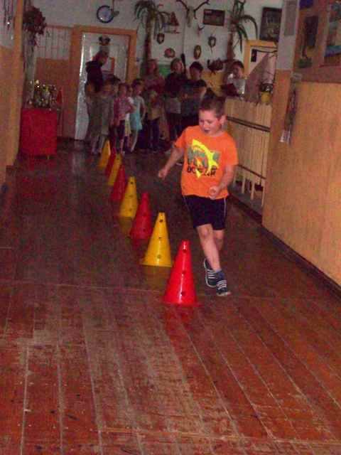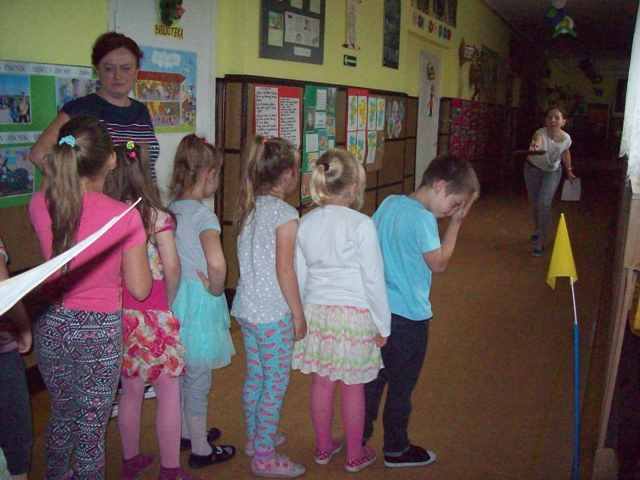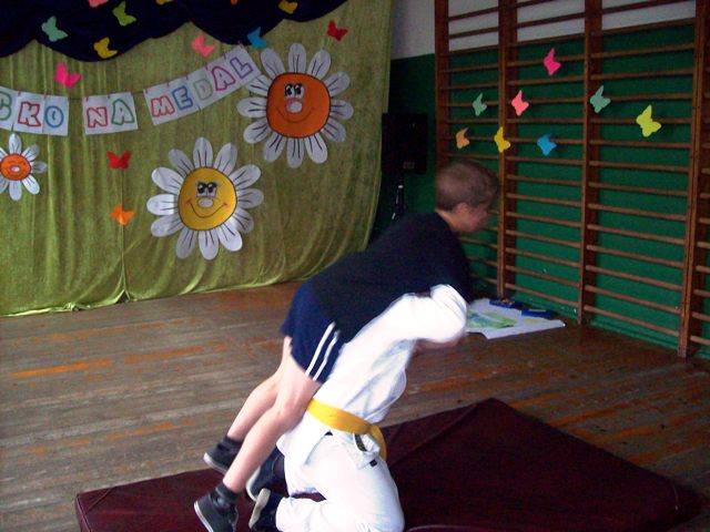 Kolejną atrakcją były potyczki sportowe. W grupach 0-I, II- III, IV-V na dolnym i górnym korytarzu miały miejsce następujące konkurencje: rzut beretem, slalom, skok w dal, rzut piłeczką i kółkami. Młodsi zawodnicy okazali się sprawniejsi fizycznie i oni zebrali wszystkie medale. I miejsce zdobył Mateusz pPleczkowski z kl. III, II miejsce – Ewa Ruskowalska kl. I, III miejsce – Sebastian Nowakowski z kl I. Później odbywały się zabawy przy muzyce. Na zakończenie po tylu atrakcjach i wysiłku fizycznym odpoczęliśmy na szkolnym boisku. Zrobiło się piknikowo, na kocykach zregenerowaliśmy siły i zjedliśmy kiełbaski pieczone na ognisku.