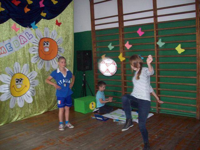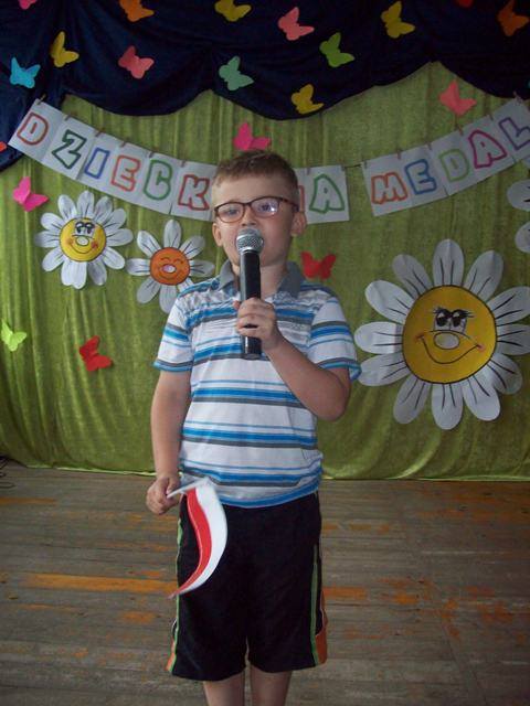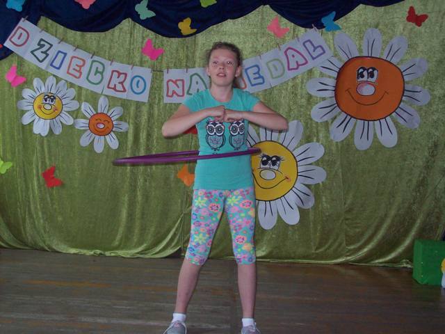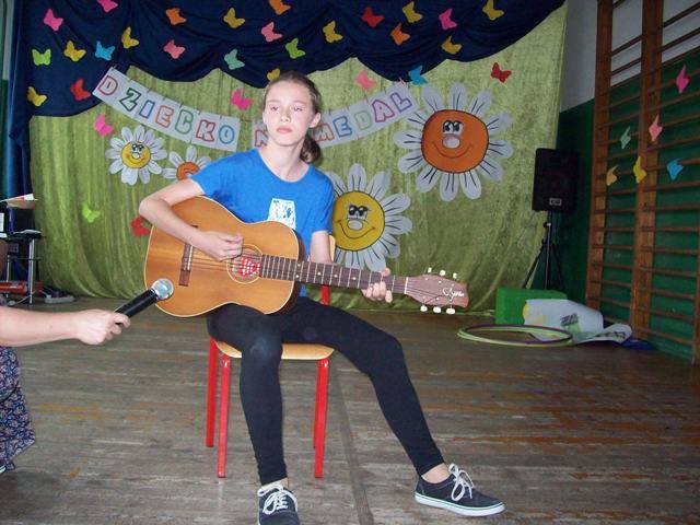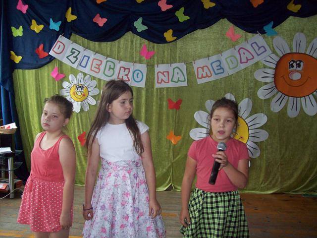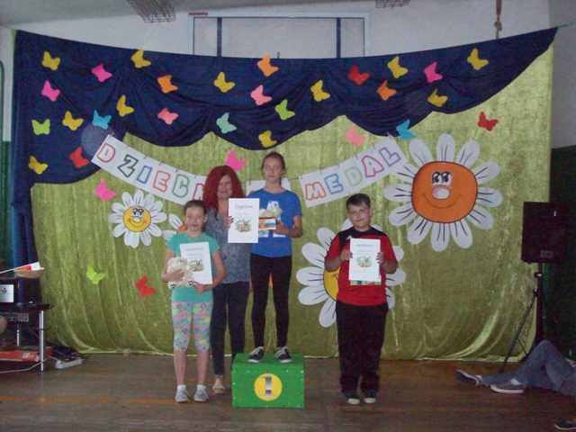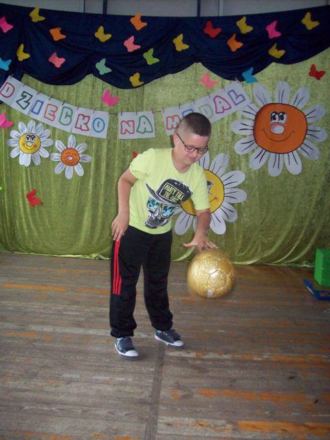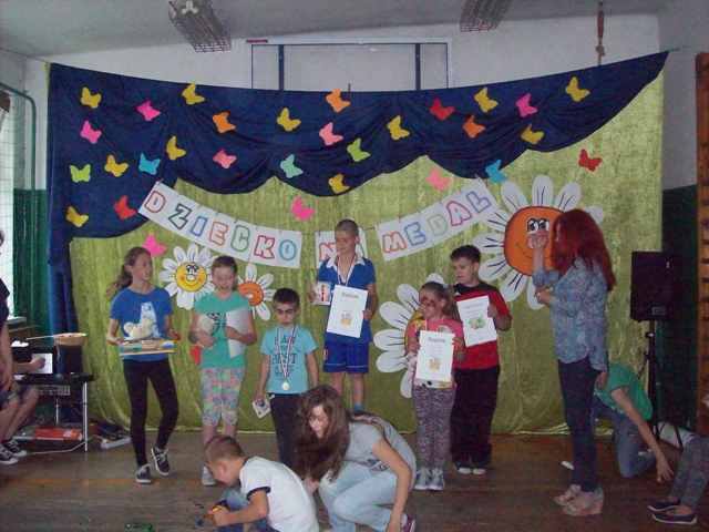 1 czerwca w naszej szkole świętowaliśmy Dzień Dziecka pod hasłem „Dziecko na medal”. Na początku wystąpił szkolny chór, który zaśpiewał kilka utworów i wprowadził wszystkich w klimat dobrej zabawy. Następnie odbył się Szkolny Talent Show. Przedstawiciele z poszczególnych klas, wcześniej zgłoszeni, zaprezentowali swoje zdolności wokalne, recytatorskie, plastyczne, sportowe. Było bardzo ciekawie. Najwięcej emocji wzbudzały pokazy sportowe. Maksymilian Golacik z kl. III krótko opowiedział o judo oraz zaprezentował stosowane chwyty w tej sztuce walki. Umiejętności- akrobacje z piłką nożną pokazali chłopcy: Mateusz Pleczkowski z kl.III, Błażej Kowalski z kl.II, Kacper Multon z kl.IV , a Wiktoria Drążewska z kl. IV tańcząc kręciła hula hop. Zwycięzcą jednak została uczennica klasy IV Patrycja Barucha, która zaśpiewała i zagrała na gitarze.