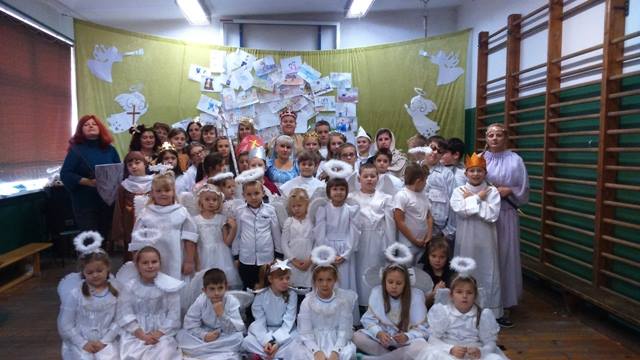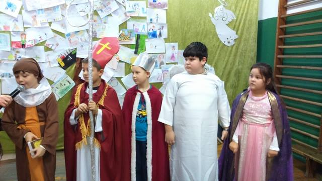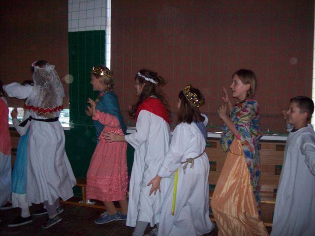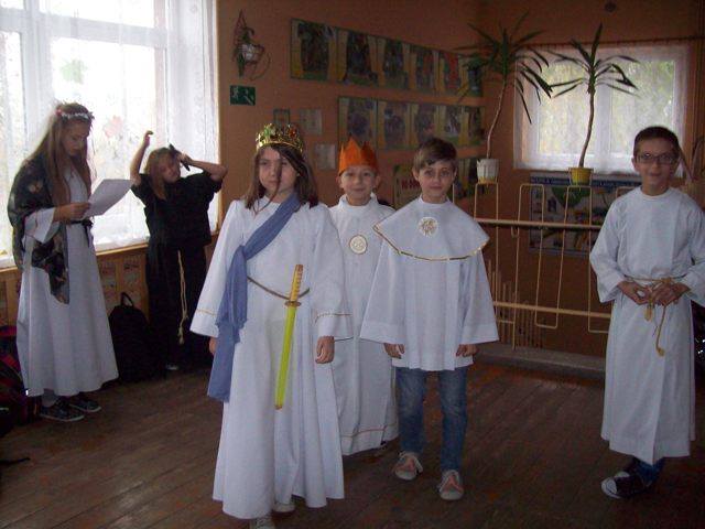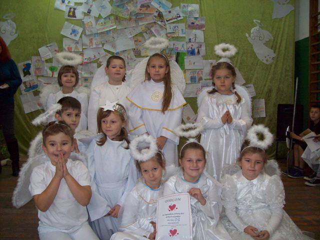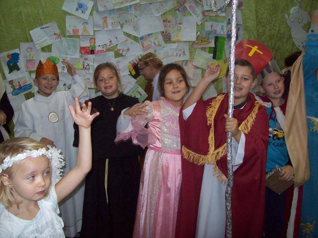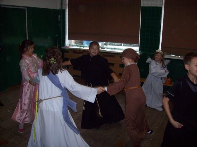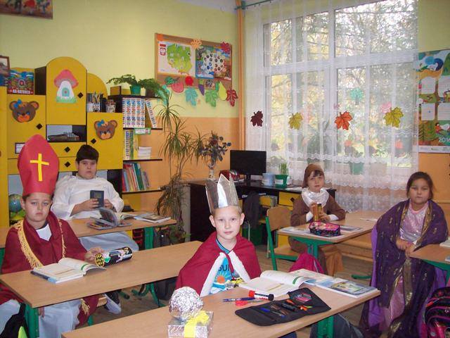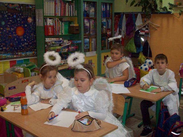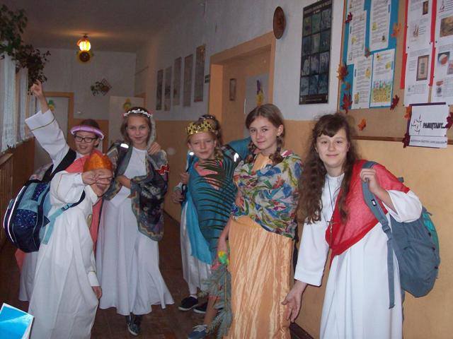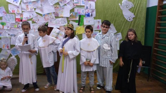 Podsumowaniem projektu „Tydzień Dobra w naszej szkole. Każdy dla każdego może zrobić coś dobrego” był bal wszystkich świętych. 27.10.2016r. uczniów kl.0-II obowiązywał strój anioła, natomiast uczniów kl. III- VI i radę pedagogiczną oraz pracowników obsługi, świętego Patrona. Każdy zaprezentował postać świętego, w którego się wcielił, przedstawił krótko historię życia i atrybuty. Dowiedzieliśmy się, komu patronują prezentowani święci. Nasza wiedza na temat życia wielu świętych została uzupełniona. Przy dźwiękach przeboju Budki Suflera” Wszyscy święci balują w niebie” czy też „Taki duży, taki mały może” Arki Noego, pląsały św. Julie, Joanna d´Arc, św. Małgorzata, Kacper czy też Mateusz. Sypał się nawet kurz, czyli złote confetti.