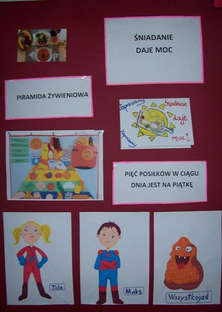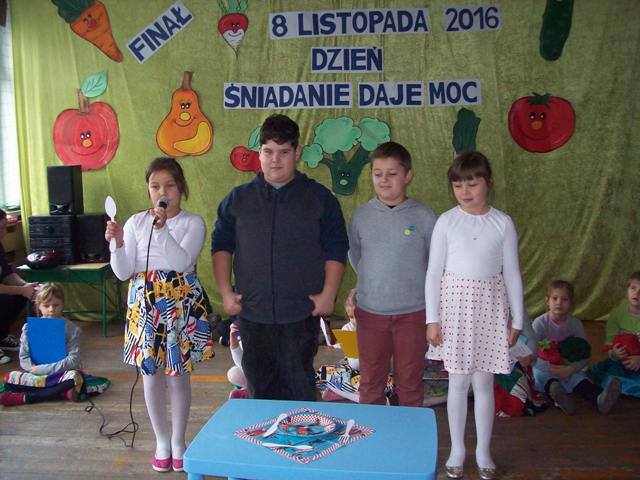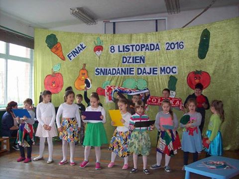 8. listopada w naszej szkole był smacznym dniem. Wtedy odbył się finał realizowanego w klasach 0-III programu Śniadanie Daje Moc. Uczniowie przez 2 miesiące pod kierunkiem nauczycieli, w towarzystwie Tosi, Maksa i Wszystkojada (bohaterów programu) zdobywali wiadomości i umiejętności dotyczące zdrowego i apetycznego odżywiania. Pracowali intensywnie wykonując misje klasowe, domowe i specjalne. Uwieńczeniem działań było pyszne i zdrowe szkolne II śniadanie. Do tego dnia wszyscy skrupulatnie przygotowali się. Zostały zaprojektowane, wykonane i wręczone zaproszenia, namalowane plakaty i ilustracje promujące zdrowe posiłki, ze szczególnym uwzględnieniem śniadania.