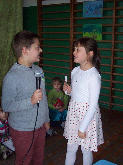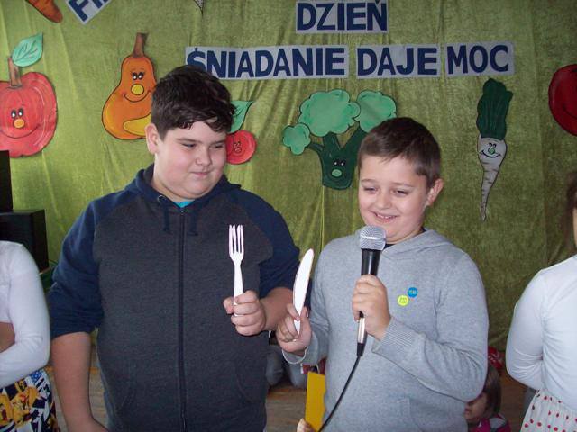 O godzinie 10 przyszedł czas na wspólne, szkolne śniadanie. Dla zaostrzenia apetytu goście obejrzeli krótką inscenizację „Przy stole”, wysłuchali owocowo-warzywnych piosenek oraz zmierzyli się z zagadkami, oczywiście o tematyce kulinarnej. Nagrody były też zdrowe i smaczne – owocowe.