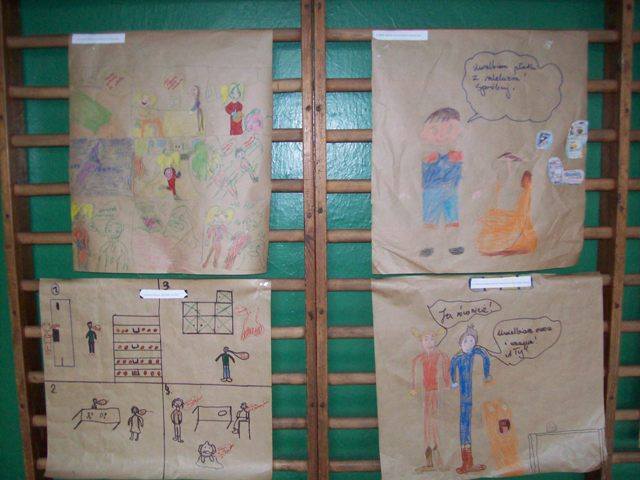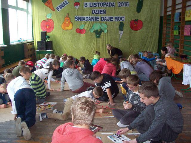 Po śniadaniu przyszedł czas na ostatnie zadanie i podsumowanie programu. Uczniowie zostali podzieleni na 12 zespołów. Każda grupa wylosowała po jednej zasadzie spośród „12 zasad zdrowego odżywiania”. Zadanie polegało na przygotowaniu jednego odcinka komiksu, w którym uczestnicy zaprezentowali jak nauczyli Wszystkojada danej zasady. Tak stworzony komiks wyeksponowaliśmy na sali gimnastycznej. Wszyscy zgodnie stwierdzili, że było to miłe i smaczne spotkanie.