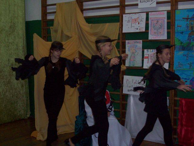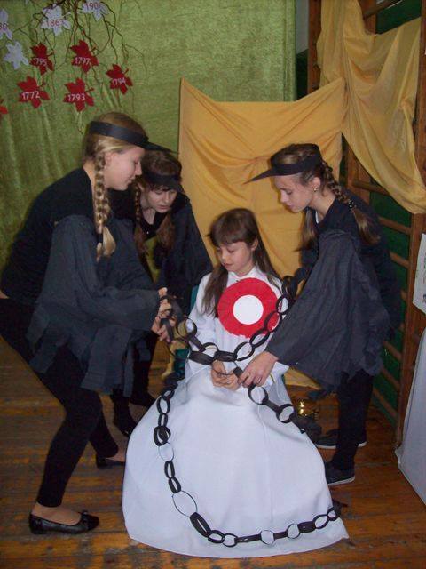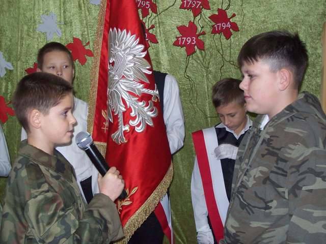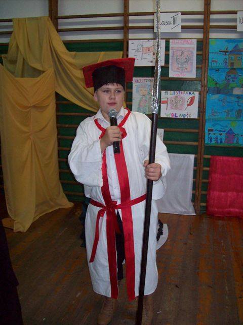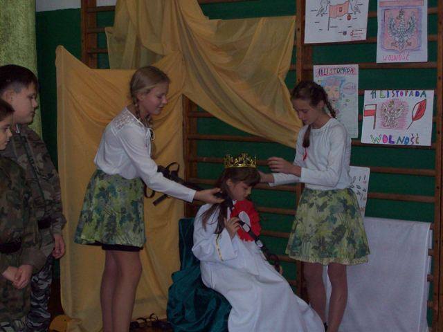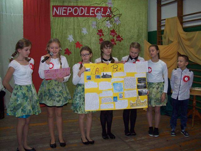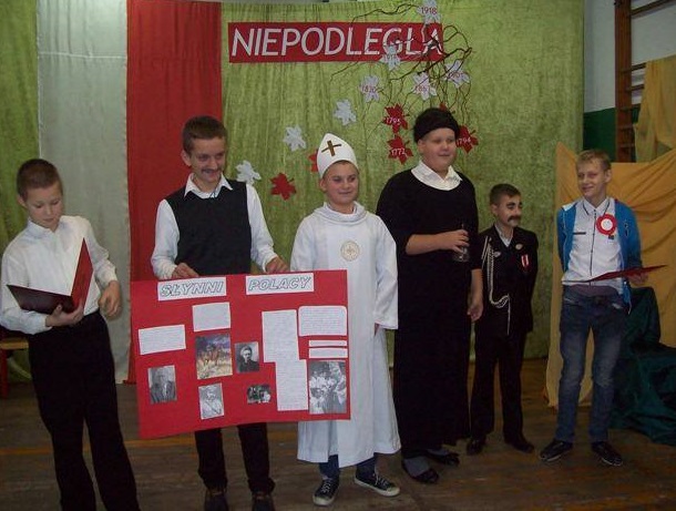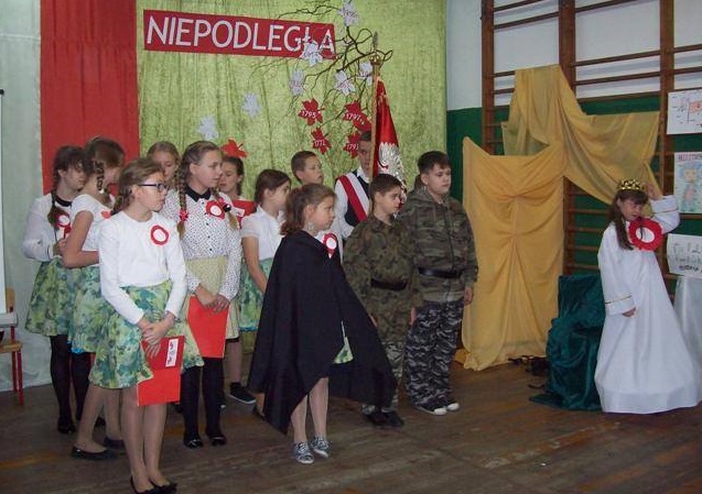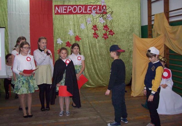Na uroczysty apel wszyscy przybyli w galowych strojach. Uczniowie klasy IV i V pod kierunkiem p. D. Orłowskiej przygotowali spektakl, który przybliżył dramatyczne wydarzenia z historii naszego kraju. Zostaliśmy przeniesieni w czasie, młodzi aktorzy ucharakteryzowani, ubrani w stroje z epoki zaprezentowali żywą lekcję historii. Nie tylko słowem, ale śpiewem, gestem, tańcem przypomnieli smutne, ale ważne fakty z naszej przeszłości. Naszą Ojczyznę, którą zagrała Julia z kl. III ubrano w piękną białą szatę ze złotą koroną na głowie. Następnie trzykrotnie otaczana była przez wrogie trzy postacie w czerni nakładające na nią łańcuchy. Obrazy te pozwoliły najmłodszym wyobrazić sobie i zrozumieć temat zaborów Polski. Polacy jednak wierzyli, że ich kraj się odrodzi. Żył przecież w ich sercach, choć nie było go na mapie Europy. Polskie Legiony, które powstały we Włoszech, kosynierzy Kościuszki, powstania Listopadowe i Styczniowe, I wojna światowa. Wszystkie te działania doprowadziły do zwycięstwa i odzyskania niepodległości po 123 latach niewoli. Tak trudną przeszłość w dziejach naszej ojczyzny nie sposób opowiedzieć bez muzyki. Pieśni patriotyczne i legionowe utwory np. „Mazurek Dąbrowskiego”, „Rota”, „Pierwsza Brygada”, „Wojenko, wojenko”, które mobilizowały do walki, dodawały sił i otuchy – odgrywały istotną rolę, a w naszym przedstawieniu uzupełniały wypowiedzi młodych aktorów. Oprawę muzyczną przygotowała p. R. Jarzyńska. Na zakończenie części artystycznej uczennice klasy V i IV przedstawiły piękny i wzruszający taniec z flagą, który kolejny raz, ale w inny sposób opowiedział historię Polski.