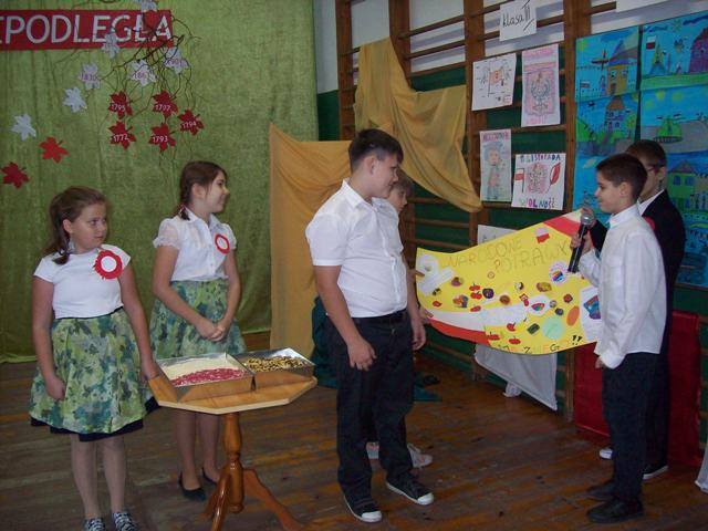 W drugiej części naszego spotkania uczniowie klas młodszych 0-III zaprezentowali kartki urodzinowe dla Niepodległej. Najciekawsze zostały wyróżnione i nagrodzone. Natomiast starsi przedstawili prezentacje. Uczniowie klasy IV przygotowali pracę przestrzenną na temat „Narodowych potraw” wykorzystując plastelinę i opowiedzieli o daniach i produktach, które królują w naszej polskiej kuchni. Oliwia i Maksymilian upiekli nawet ciasta. Uczniowie klasy V przedstawili plakat na temat „ Najpiękniejszych zabytków” w Polsce, więc przenieśliśmy się w niezwykłe zakątki naszego kraju m.in.: Warszawy, Krakowa, Częstochowy, Szczecina, Malborka. Klasa VI zaprezentowała „Najsłynniejszych Polaków”. Chłopcy wcielili się w postacie: Papieża Jana Pawła II, marszałka Józefa Piłsudskiego, Marii Curie Skłodowskiej oraz Lecha Wałęsę i krótko przybliżyli biografię tych wybitnych i zasłużonych Polaków.