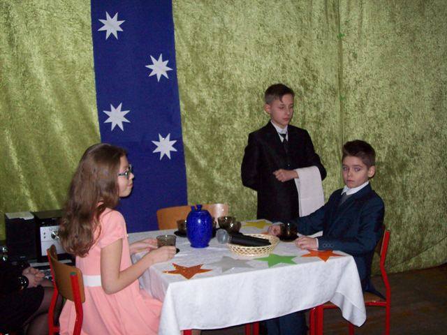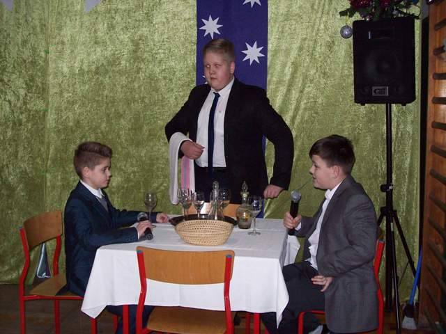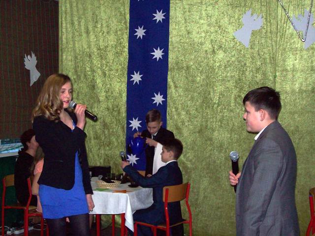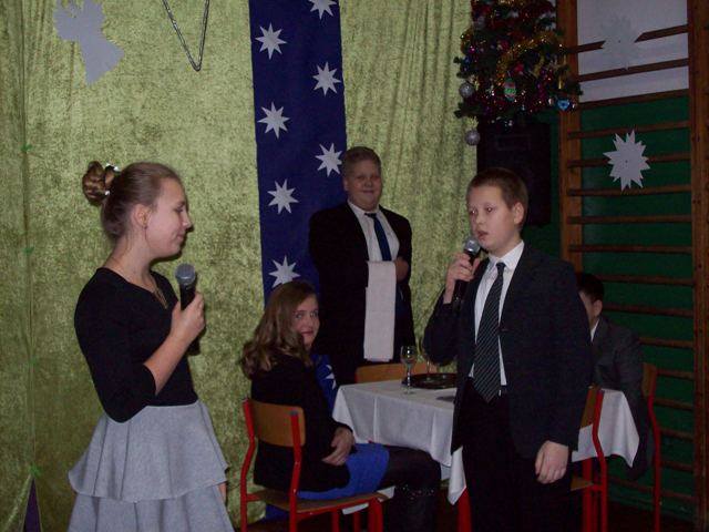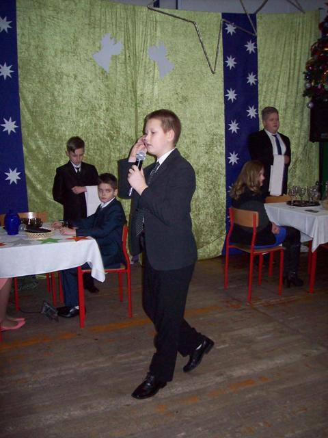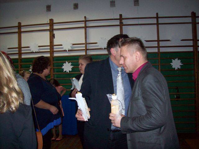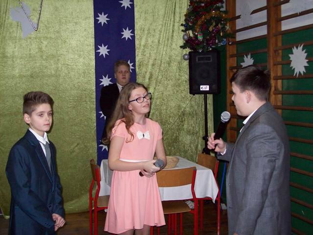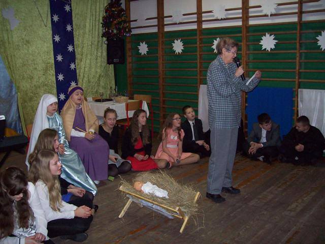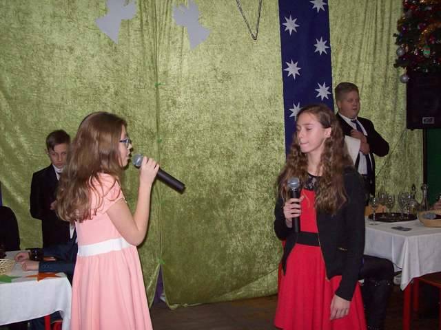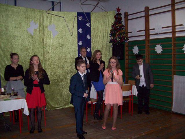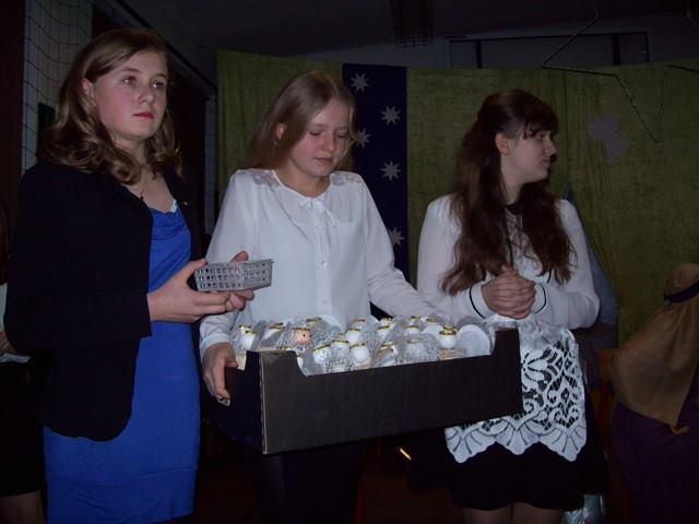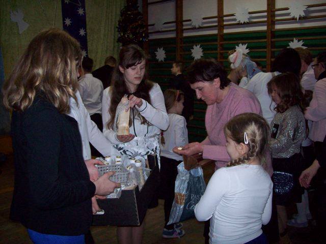 Następnie odbył się koncert kolęd. Wśród zaproszonych gości nie mogło zabraknąć zaprzyjaźnionej placówki - ZSS i DPS w Goślicach. Jedna z mieszkanek DPS p. Małgosia Machalica zaprezentowała kilka kolęd, następnie wszyscy wspólnie kolędowaliśmy. Na zakończenie szkolnej uroczystości odbyła się aukcja aniołków i lalek, z których dochód zostanie przeznaczony na cele charytatywne.
