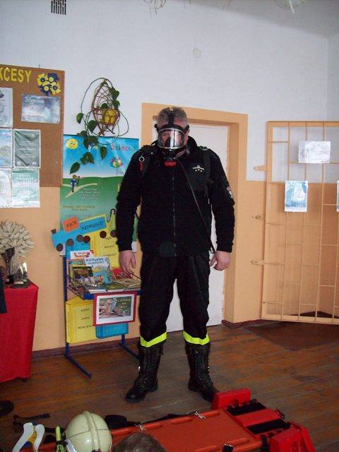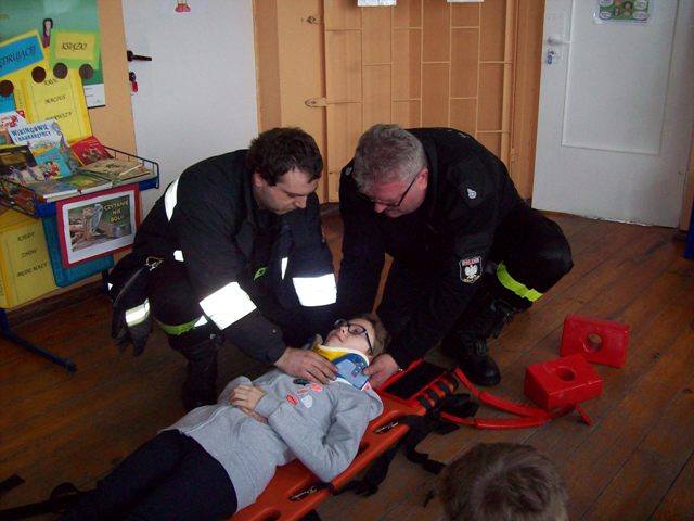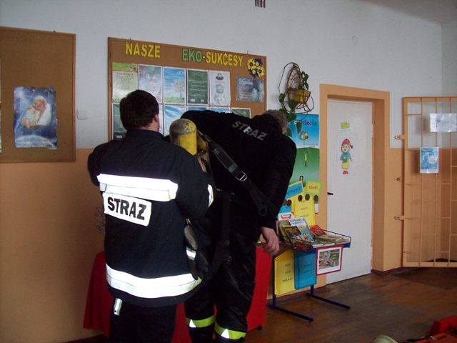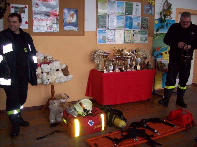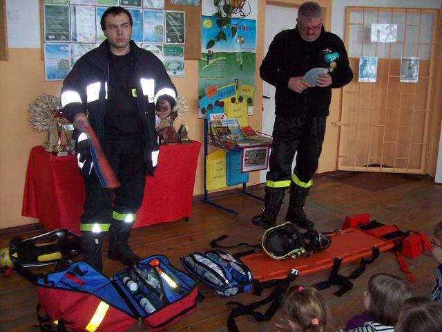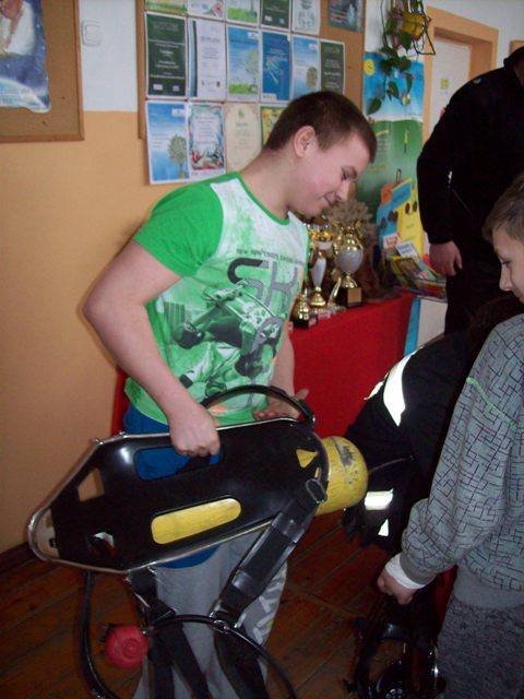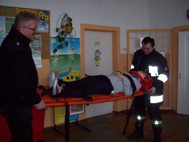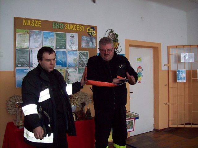 Przedstawiciele straży pożarnej przeprowdzili również pogadankę o bezpieczeństwie podczas ferii zimowych. Przestrzegali m.in.: przed urządzaniem ślizgawek na skutych lodem jeziorach, stawach i rzekach oraz, że zjazdy na sankach mogą odbywać się tam, gdzie górki nie kończą się na ruchliwych drogach lecz w bezpiecznych miejscach. Na koniec uczniowie zapoznali się z podstawowym sprzętem ratowniczym.