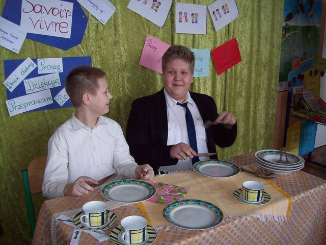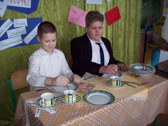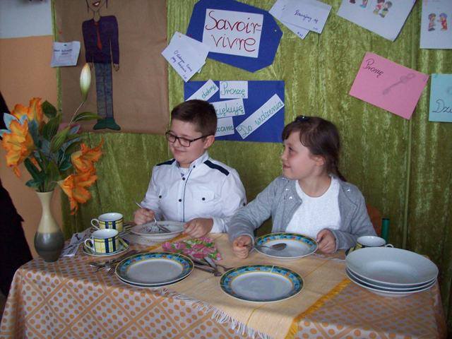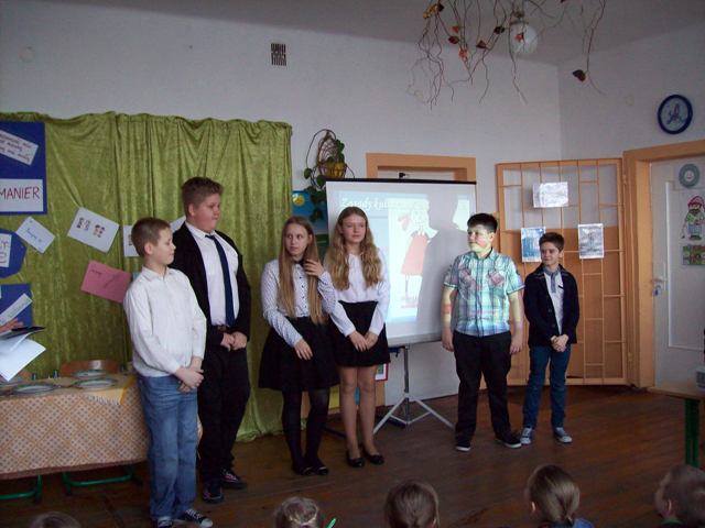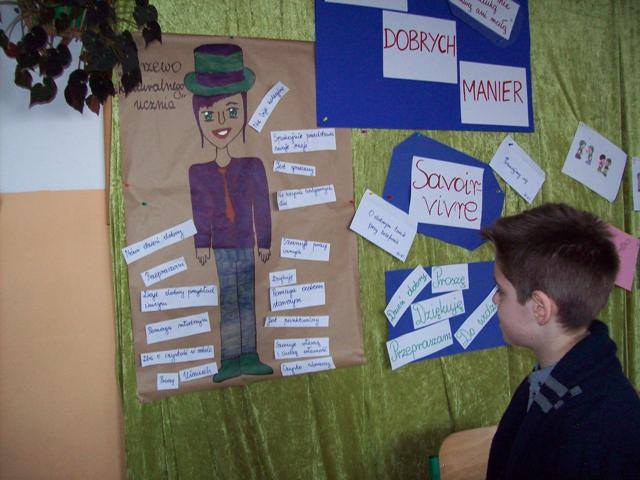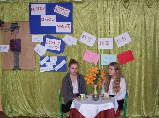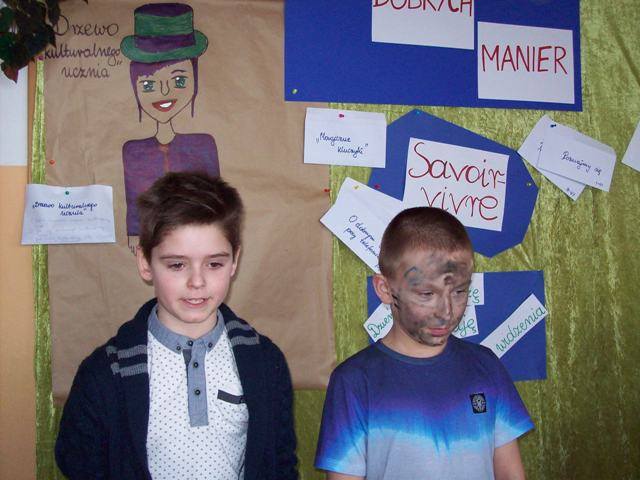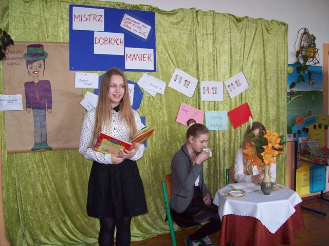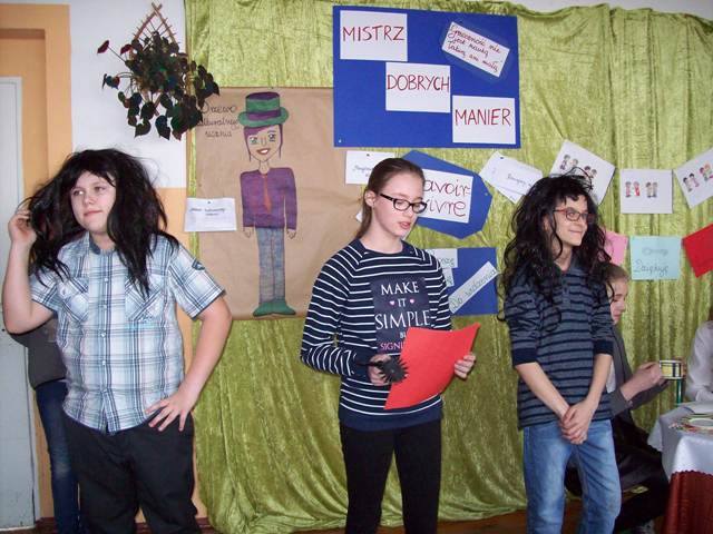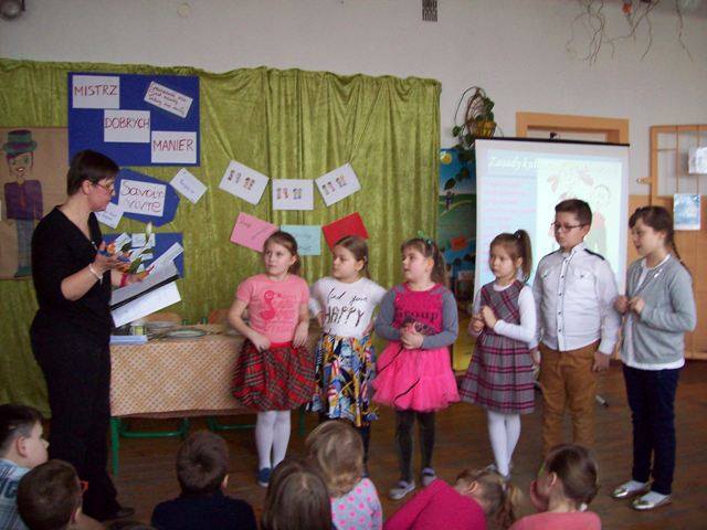 W naszej szkole odbył się turniej o tytuł „Mistrza dobrych manier”. Przygotowania trwały kilka tygodni. Uczniowie w każdą środę słuchali mini-wykładów na temat savoir- vivre. Naszym przewodnikiem była książka G. Kasdepke pt „ Bon czy ton savoir vivre dla dzieci”. Na początku spotkania uczniowie kl. V i IV zaprezentowali krótkie przedstawienie pt. „Jan Brzechwa uczy nas kultury”. Dwie elegancko ubrane panie rozmawiały w kawiarni przy stoliku i narzekały na współczesną młodzież. Uważały bowiem, że dzisiejsza młodzież nie ma w ogóle pojęcia o savoir –vivre. Ich krytyka była przeplatana wierszami: „Kwoka”, „Grzebień i szczotka”, „Brudas”, „Samochwała”, „Kłamczucha”. Na końcu scenki pojawiły się urażone dzieci i ich stwierdzenie, że wśród tych niewychowanych są kulturalne, grzeczne, dbające o higienę, nieprzemądrzałe i niezarozumiałe…