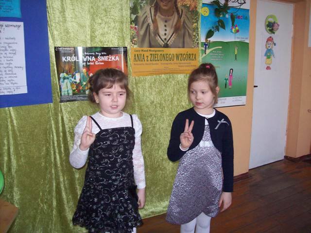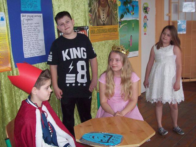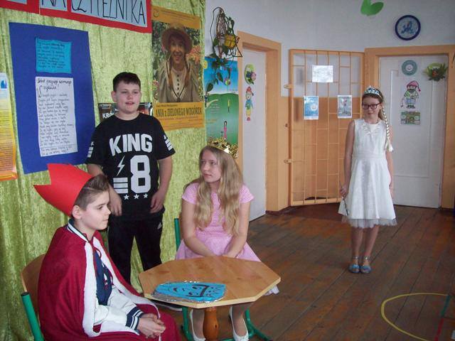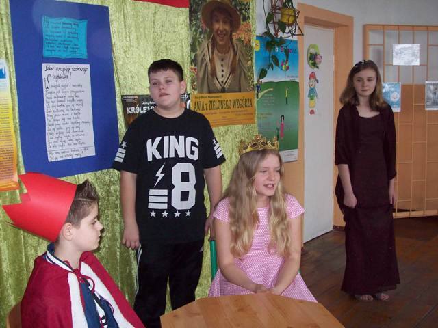 28.03.2017 roku w naszej szkole obchodzony był Dzień Teatru połączony z Pasowaniem na czytelnika uczniów kl. I. W ramach obchodów święta ludzi sceny uczniowie kl IV i V zaprezentowali przedstawienie pt. „Wybór księżniczki- pełny serwis”. Królowa postanowiła, że najwyższy czas, żeby syn wybrał żonę. Królewicz poprosił służbę o magiczne zwierciadło, które miało pomóc w dokonaniu właściwego wyboru. Następnie odbyły się krótkie charakterystyki kandydatek. Czarodziejskie lustro w dowcipny sposób zaprezentowało kolejno piękne bohaterki ze znanych i mniej znanych baśni m.in. Czerwonego Kapturka, Księżniczkę na ziarnku grochu, Królową Lodu, Kopciuszka, Dziewczynkę z zapałkami, Calineczkę, Śpiącą królewnę. Po zakończonym pokazie na powtarzające się pytanie królowej: „I cóż synu?” za każdym razem młody władca znajdował powód dla którego pretendentki nie spełniały jego oczekiwań. Magiczne Zwierciadło już bardzo zniecierpliwione zaproponowało jeszcze jedną konkurentkę- chociaż nie obsadzono jej w żadnej roli – Oliwię z kl. IV. Na szczęście ta kandydatka zauroczyła naszego wymagającego księcia.