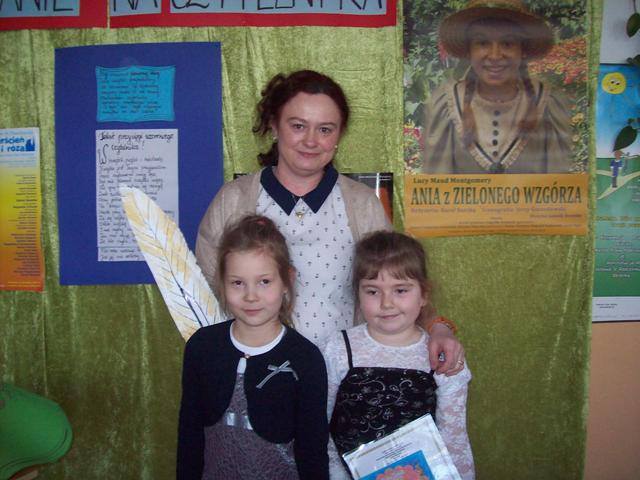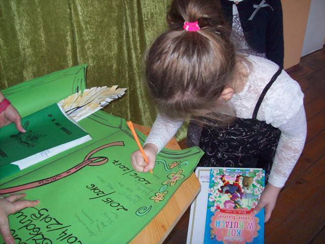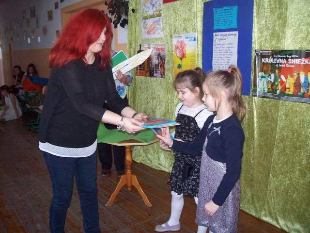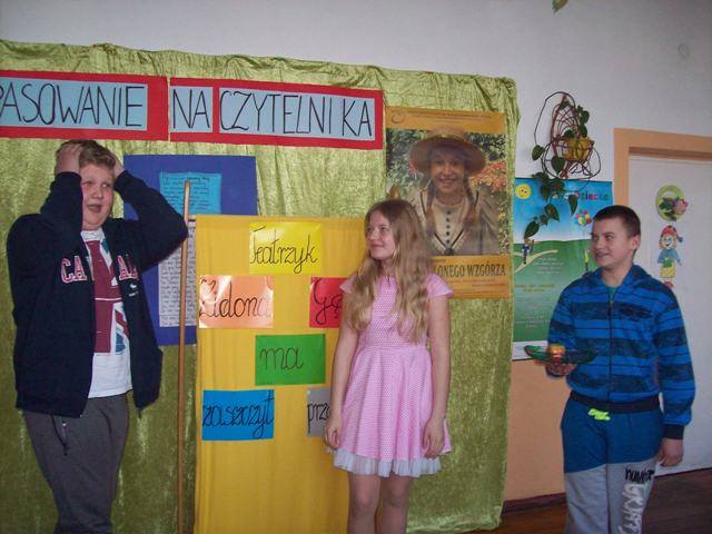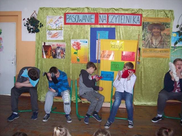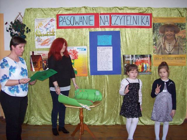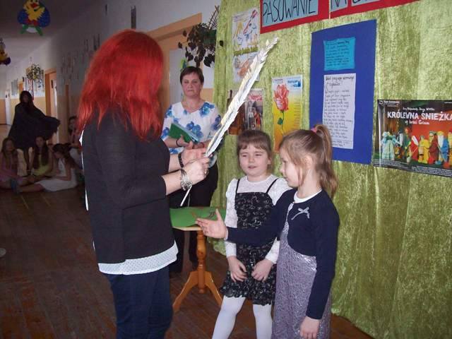 Uczennice klasy pierwszej powiedziały wiersz „ Kapelusz” W. Chotomskiej. Następnie zdały celująco egzamin wyjaśniając z jakimi bohaterami baśni związane były rekwizyty z czarodziejskiego pudełka. A ukryły się tam m.in. korona, różdżka, koszyczek z jedzeniem, figurka chłopca z długim nosem, pantofelek, jabłuszko.... Potem złożyły uroczystą przysięgę i zostały pasowane przez Dyrektora szkoły p. J. Bojanowską na czytelników szkolnej biblioteki. Uczennice wpisały się do pamiątkowej księgi, otrzymały dyplomy i upominek książkowy, który ma zachęcać do korzystania z biblioteki i czytania książek.