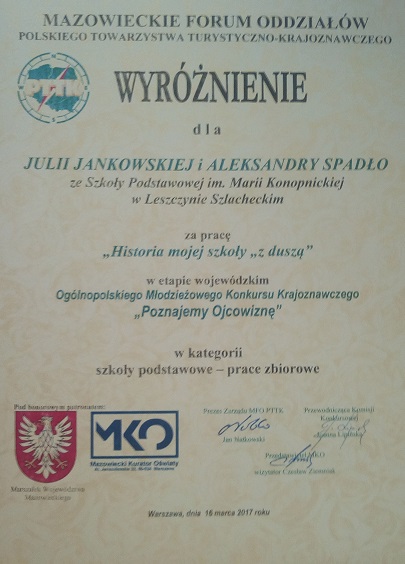 Ola Spadło i Julia Jankowska uczennice kl. V otrzymały wyróżnienie na szczeblu wojewódzkim w Konkursie Krajoznawczym Województwa Mazowieckiego "Poznajemy Ojcowiznę". Wcześniej zajęły I miejsce w eliminacjach rejonowych. Swoją pracę- Historia mojej szkoły „Z duszą” przygotowały pod kierunkiem p. D. Orłowskiej.