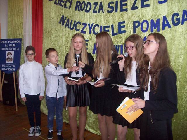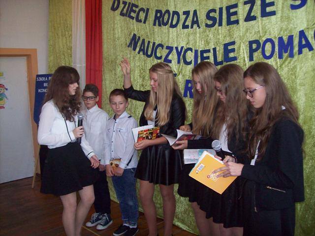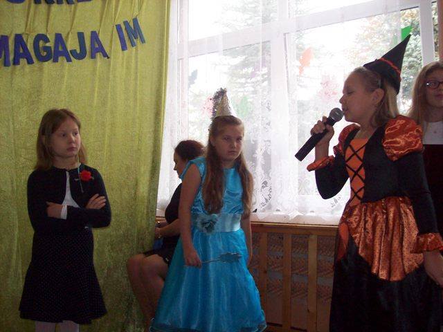 W drugiej części spotkania uczniowie klasy VI przedstawili krótką scenkę „Pani na opak” z okazji Dnia Nauczyciela. Uczniowie trochę ponarzekali na swoją nauczycielkę. ponieważ ta zawsze wszystko zauważy i niczego nie przeoczy. Niespodziewanie odwiedziła ich wróżka Buzbajera. Ten niezwykły gość narobił zamieszania rzucając zaklęcie na wychowawczynię, gdyż pani zmieniła się nie do poznania. Robiła ciągle przerwy, nie wymagała pracy, stawiała złe stopnie….Uczniowie byli przerażeni taką zmianą. Szybko postanowili odczarować swojego pedagoga. Dobrze, że wróżka Buzbajera zechciała to uczynić.
