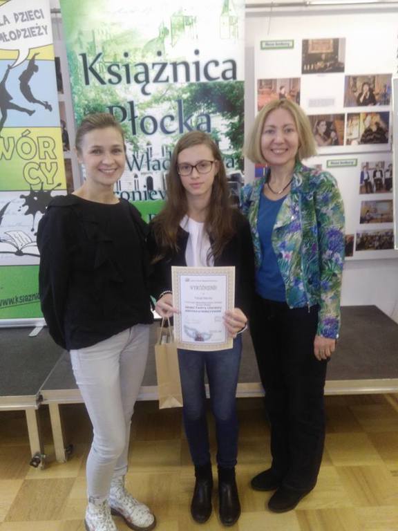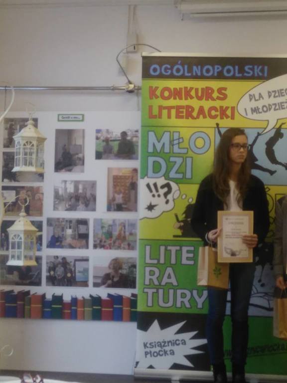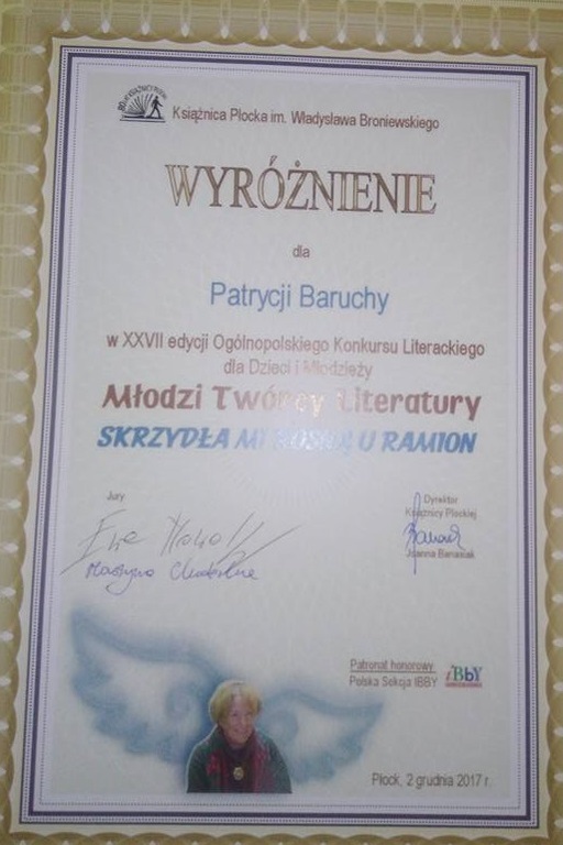Patrycja Barucha uczennica kl. VI otrzymała wyróżnienie w XXVII Ogólnopolskim Konkursie Literackim Dla Dzieci i Młodzieży Młodzi Twórcy Literatury "Skrzydła mi rosną u ramion ". Wręczenie nagród miało miejsce w Książnicy Płockiej im. Władysława Broniewskiego. Gratulujemy!