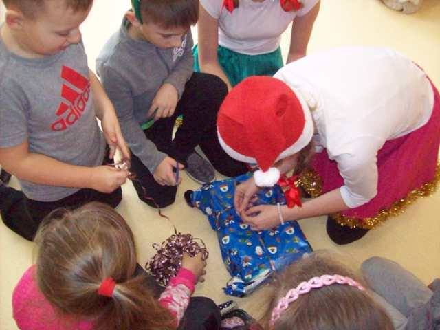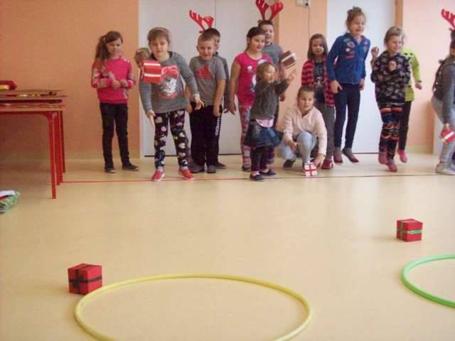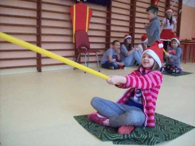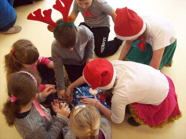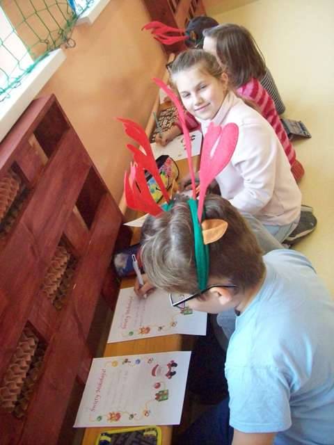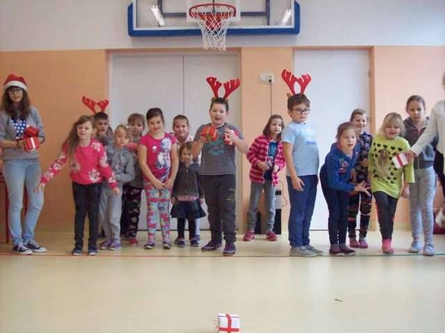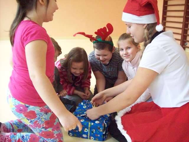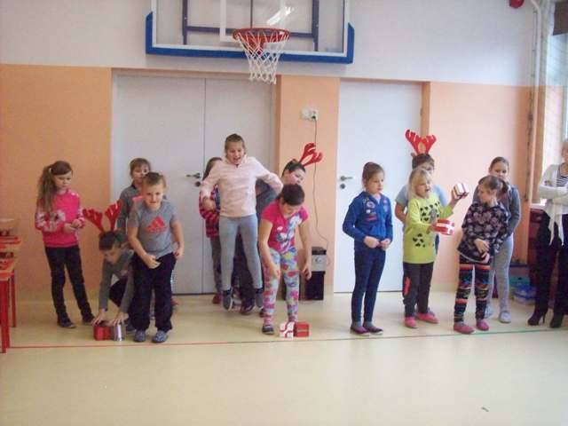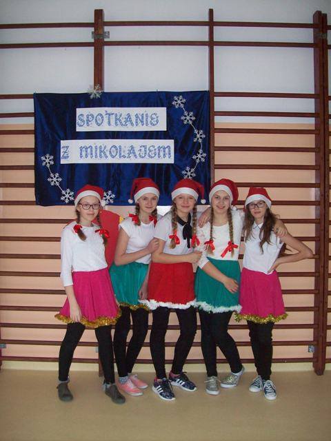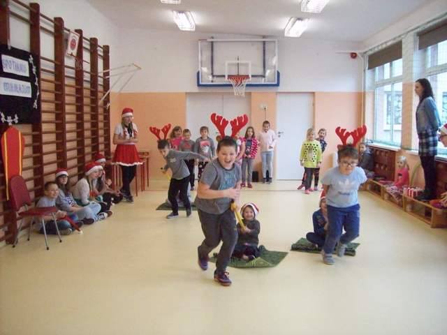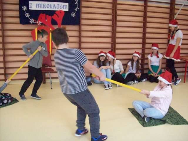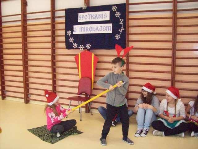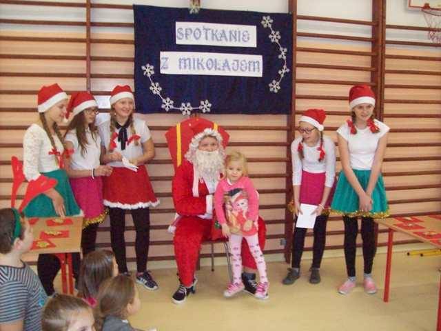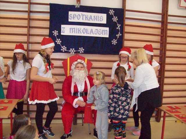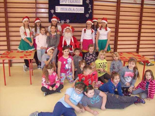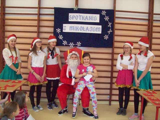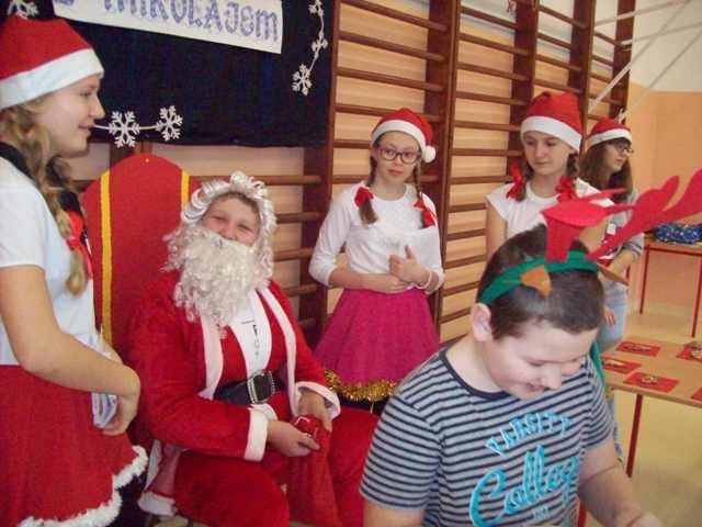 Natomiast Samorząd Uczniowski w tym dniu zorganizował dla swoich młodszych kolegów z kl. 0 -III spotkanie z Mikołajem. Wszystko zaczęło się od listu od Św. Mikołaja, w którym było pierwsze zadanie i wskazówka, gdzie należy się udać. Wszystkie dzieci dotarły na salę gimnastyczną, a tam czekały kolejne wyzwania. Śnieżynki – uczennice kl. VI sprawdzały, czy dzieci nadają się na pomocników Mikołaja. Były wyścigi zaprzęgów reniferów, pakowanie prezentów, dekorowanie pierniczków i pisanie listów do Mikołaja. Na koniec przybył w końcu Św. Mikołaj, w którego rolę wcielił się Kacper Stępień uczeń kl. VII.