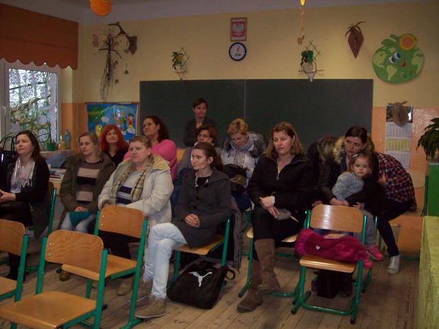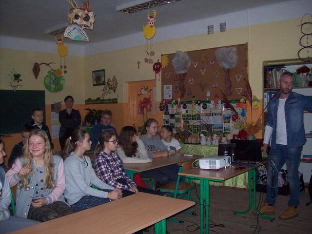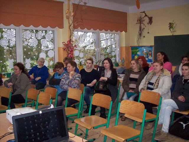Po prelekcji dla uczniów odbyło się spotkanie dla dorosłych: rady pedagogicznej i rodziców. Podobnie jak z uczniami policjant poprzez prezentację multimedialną, pogadankę i przykłady uwrażliwił nas na zagrożenia czyhające na naszych uczniów i dzieci.