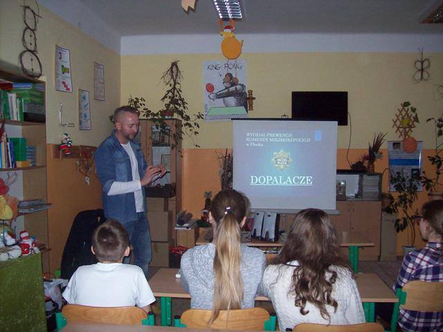 7 grudnia - spotkanie z funkcjonariuszem policji aspirantem Krzysztofem Rogowskim z Komendy Miejskiej Policji w Płocku. Na spotkaniu z uczniami klas VI i VII aspirant omówił zagadnienia dotyczące przeciwdziałania uzależnieniom ze szczególnym uwzględnieniem substancji psychoaktywnych oraz cyberprzemocy. Funkcjonariusz policji przeprowadził pogadankę dla uczniów na temat przestrzeganie prawa. Prezentacja obejmowała zasady bezpieczeństwa w sieci, w szkole, w domu oraz podstawowe reguły prawa cywilnego i karnego - w konwencji odpowiedniej dla grupy uczniów szkoły podstawowej. Pan policjant przedstawił nam również tematykę przestępczości nieletnich i wykonanych kar orzeczonych przez sądy dla nieletnich oraz sądy powszechne. Przekazał informacje dotyczące używania środków psychoaktywnych.