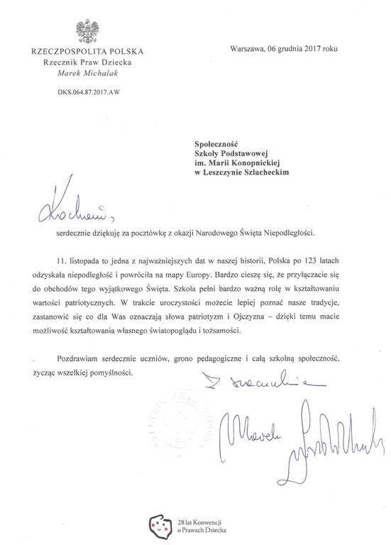 W podziękowaniu za kartkę z życzeniami z okazji Narodowego Święta Niepodległości otrzymaliśmy od Pana Marka Michalaka Rzecznika Praw Dziecka list oraz cenne publikacje pierwszego nieformalnego rzecznika dzieci, lekarza i pedagoga – Janusza Korczaka. Podarowane książki wzbogacą księgozbiór szkolnej biblioteki. Dziękujemy!