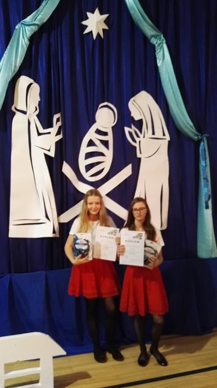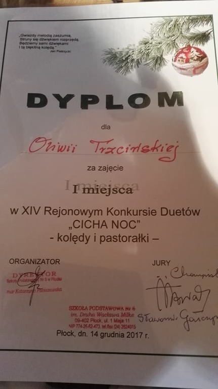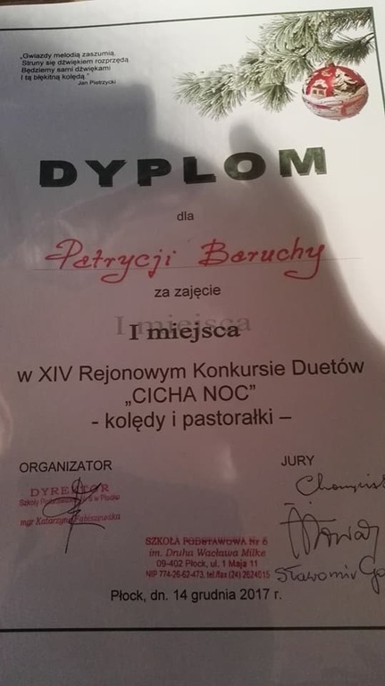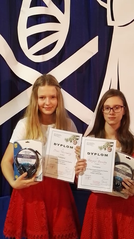 Uczennice naszej szkoły Patrycja Barucha i Oliwka Trzcińska z klasy VI zajęły I miejsce w XIV Konkursie Duetów "Cicha noc" organizowanym przez Szkołę Podstawową nr 6 w Płocku. Dziewczynk zaśpiewały kolędę "Gdy śliczna panna". Gratulujemy!