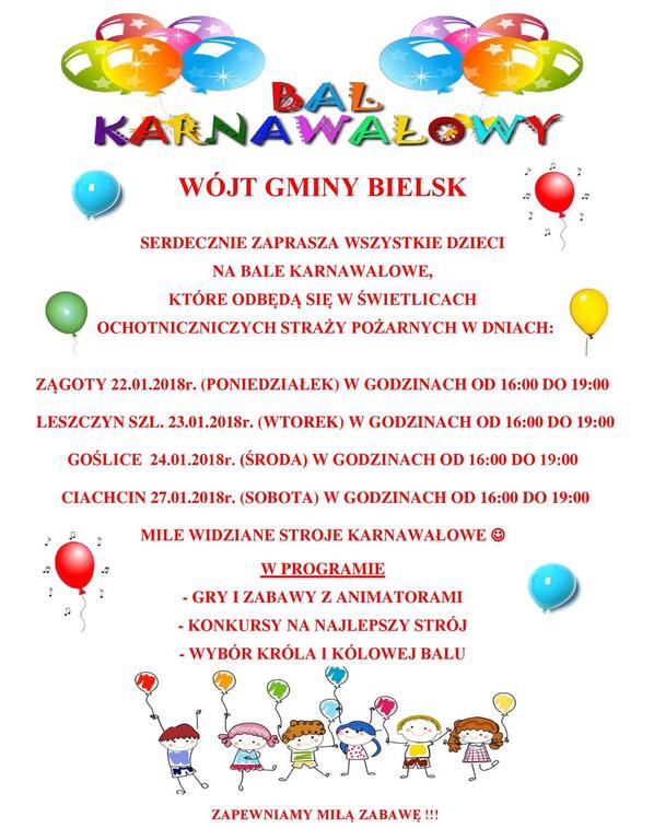 Wójt Gminy Bielsk zaprasza wszystkie dzieci na bal karnawałowy, który odbędzie się
