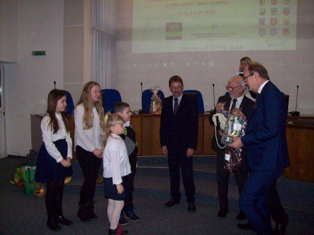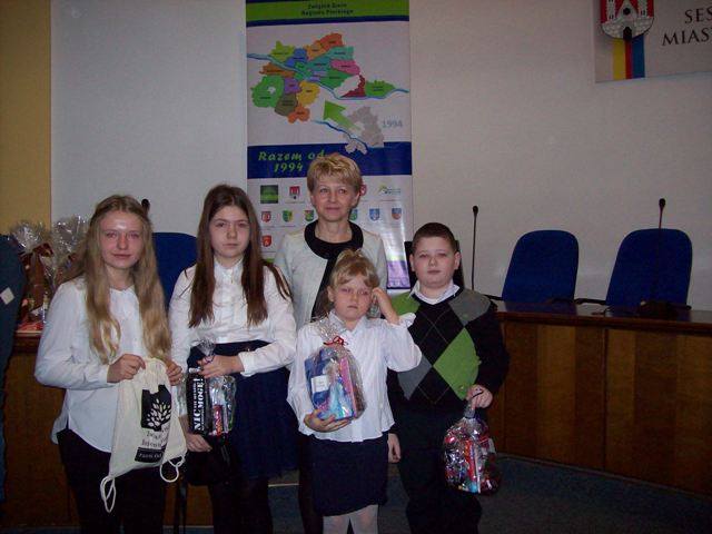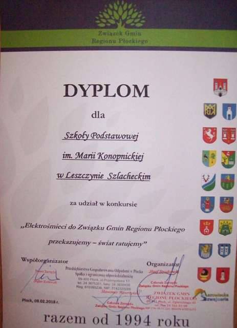 W Urzędzie Miasta w Płocku odbyło się podsumowanie konkursu „Elektrośmieci do Związku Gmin Regionu Płockiego przekazujemy – świat ratujemy” organizowanego przez Związek Gmin Regionu Płockiego. Do konkursu przystąpiły 22 szkoły z terenu gmin: Bielsk, Brudzeń Duży, Stara Biała, Czerwińsk nad Wisłą, Wyszogród, Gostynin, Szczawin Kościelny, Gąbin, Staroźreby i Drobin. Łączna masa odebranych elektrośmieci przez wszystkie placówki wyniosła 36100 kg. Nasza szkoła łącznie zgromadziła 1280 kg, co w przeliczeniu na jednego ucznia wynosi około 30 kg. W klasyfikacji końcowej zajęliśmy V miejsce. Podczas uroczystości naszą szkołę reprezentowali uczniowie, którzy wyjątkowo zaangażowali się w akcję: Maja Pietrzak kl. I, Maciej Potera kl. III, Oliwka Kasińska kl. V oraz Oliwka Trzcińska kl. VI. Tak wysoką lokatę zawdzięczamy również naszym rodzicom, na których spadł ciężar dostarczenia elektrośmieci do szkoły. DZIĘKUJEMY