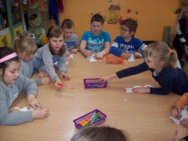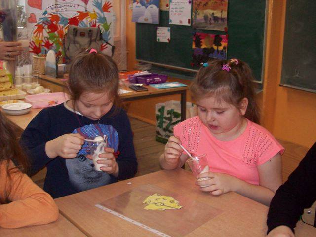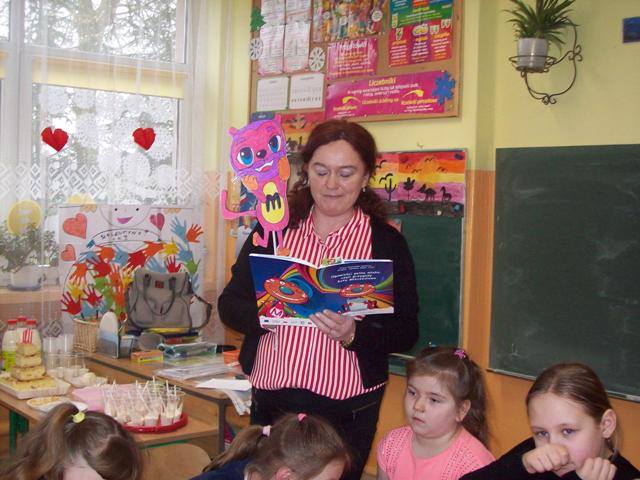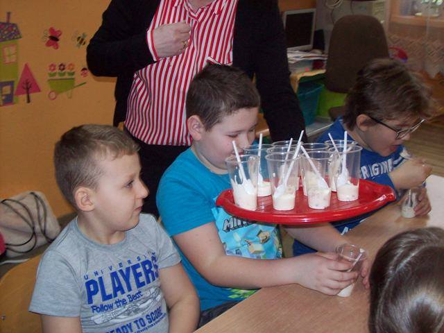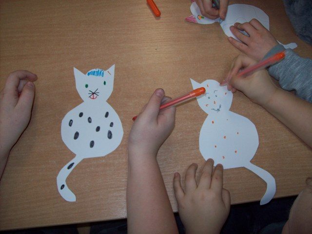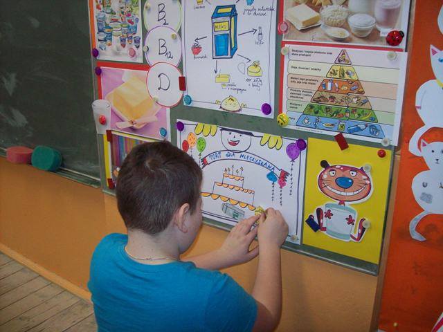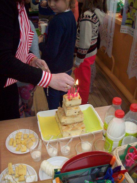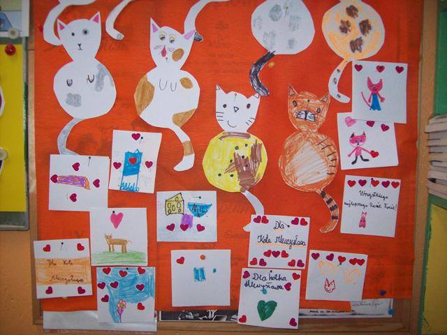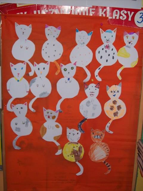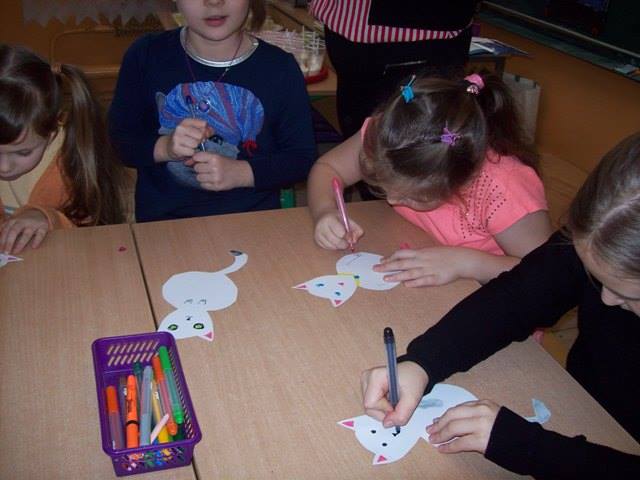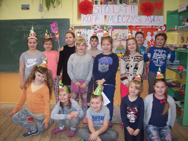 Klasy młodsze obchodziły dziś Dzień Kota. Odbyła się mleczna lekcja z kotem Mleczysławem - „Mleko i jego przetwory”. Dzieci malowały swoje kotki, układały puzzle, degustowały przetwory mleczne, tworzyły tort urodzinowy dla kota Mleczysława, napisały kartkę z życzeniami dla jubilata oraz zaśpiewały 100 lat. Wspólne spotkanie zakończyło się degustacją tortu kota Mleczysława.
