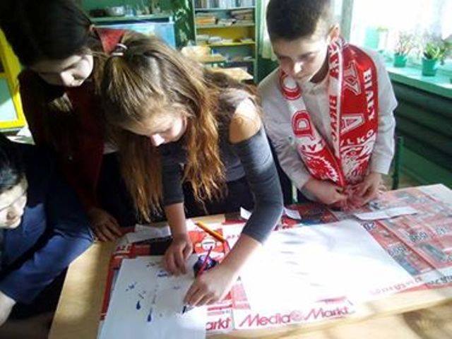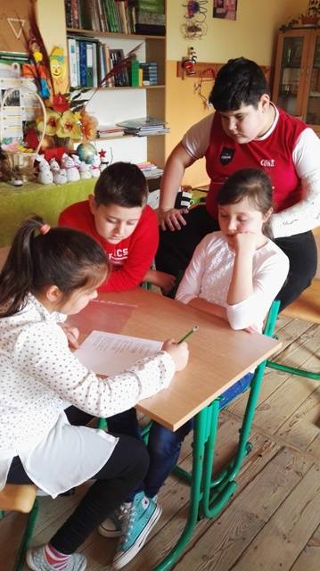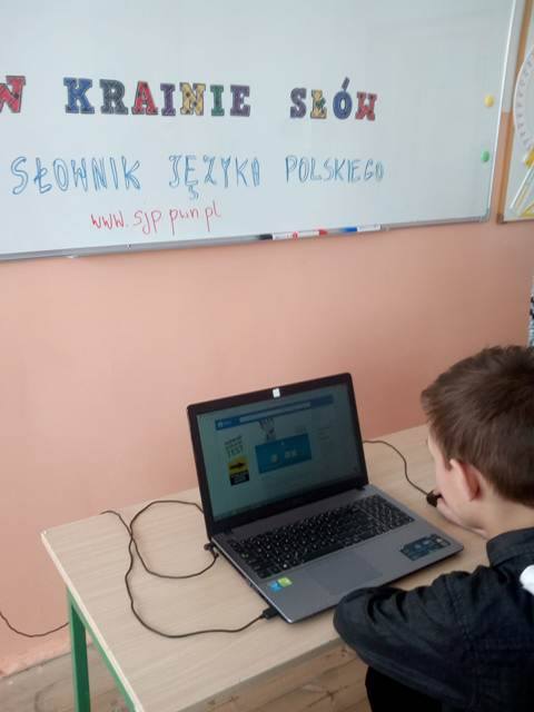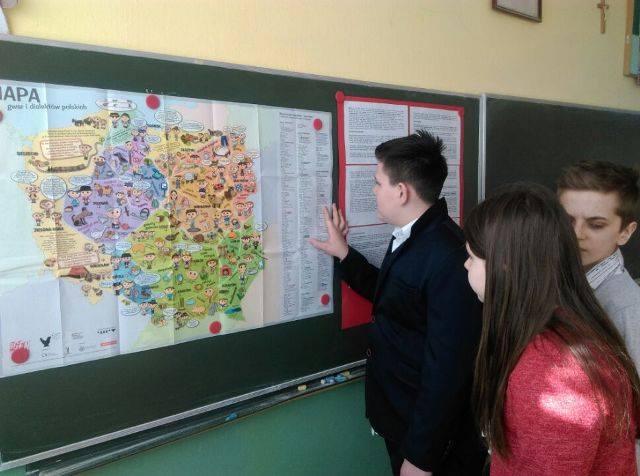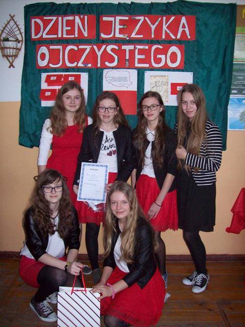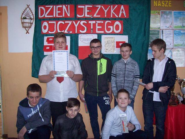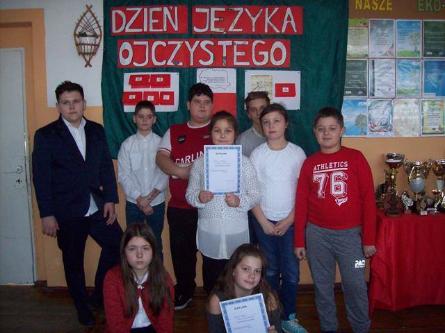 W piątek 23.02.2018 r. uczniowie klas IV- VII w ramach obchodów Dnia Języka Ojczystego uczestniczyli w grze polonistycznej „Z polszczyzną za pan brat”. W skład drużyn wchodzili uczniowie poszczególnych klas, którzy wykonywali zadania w sześciu krainach. Najpierw musieli ją odszukać, a następnie w ciągu 5 minut poprawnie wykonać zadanie. Te magiczne miejsca: to kraina gwary i dialektu, kraina słów, kraina pieśni patriotycznej, kraina kaligrafii i pięknego czytania, kraina frazeologizmów oraz kraina ortografii i gramatyki. W sześciu salach naszej szkoły królowała wiedza polonistyczna: słowa gwarowe do których należało dopisać odpowiedniki ogólnopolskie (podpowiedzią mogły okazać się eksponaty z izby regionalnej oraz mapa gwar), teksty z lukami do uzupełnienia - „Roty”, „Bogurodzicy” i hymnu „Mazurka Dąbrowskiego”. Zawodnicy układali na czas słowa w programie komputerowym oraz czytali „łamańce językowe”, pisali używając stalówki i atramentu, rozwiązywali rebusy, diagramy, uzupełniali przysłowia, poprawiali błędy w związkach frazeologicznych itp. W czasie tej szkolnej zabawy sprawdzającej wiedzę z naszego ojczystego języka panowała zdrowa rywalizacja i pozytywne emocje. Uczniowie z najstarszych klas: VI i VII zdobyli największą i tę samą ilość punktów. O zwycięstwie zadecydowała liczba zebranych kopert z literkami. Szóstoklasistki miały ich aż cztery. Zwyciężczynie otrzymały nagrody książkowe - „Legendy polskie”. Na zakończenie akcji promującej dbałość o naszą polszczyznę poczęstowaliśmy się słodkimi ciasteczkami w kolorze biało-czerwonym, na których znajdowały się litery z polskiego alfabetu.