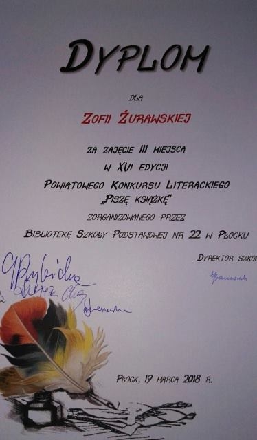Zosia Żurawska (kl.III) zajęła III miejsce w XVI edycji Powiatowego Konkursu Literackiego "Piszę książkę" zorganizowanego przez bibliotekę Szkoły Podstawowej nr 22 w Płocku pod honorowym patronatem Książnicy Płockiej. Gratulujemy!
