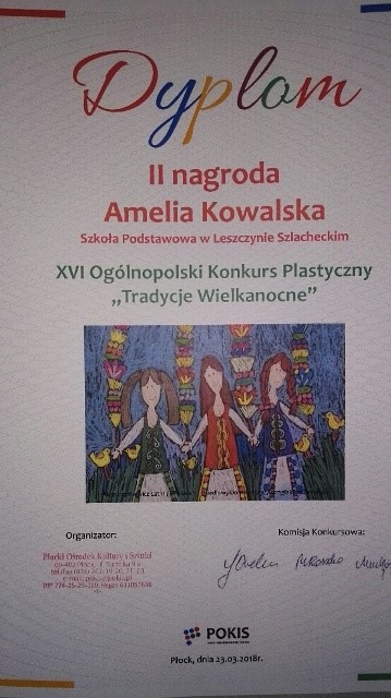 Amelka Kowalska (kl.I) zdobyła II nagrodę w XVI Ogólnopolskim Konkursie Plastycznym „Tradycje Wielkanocne”. Organizatorem konkursu był POKIS w Płocku. Gratulujemy!