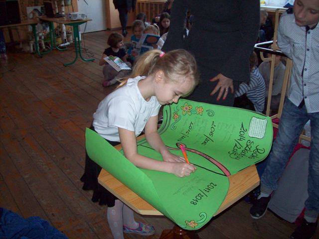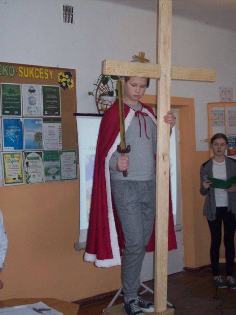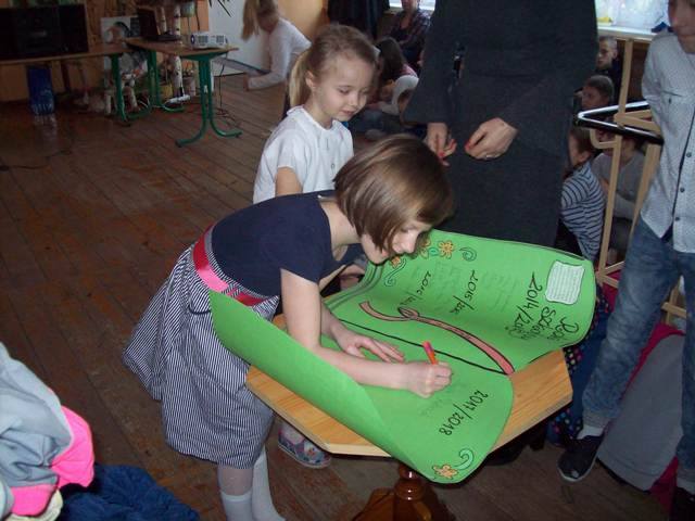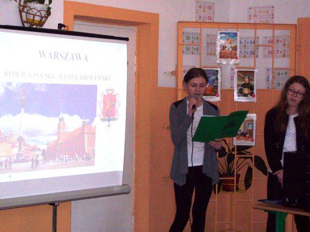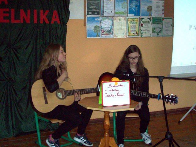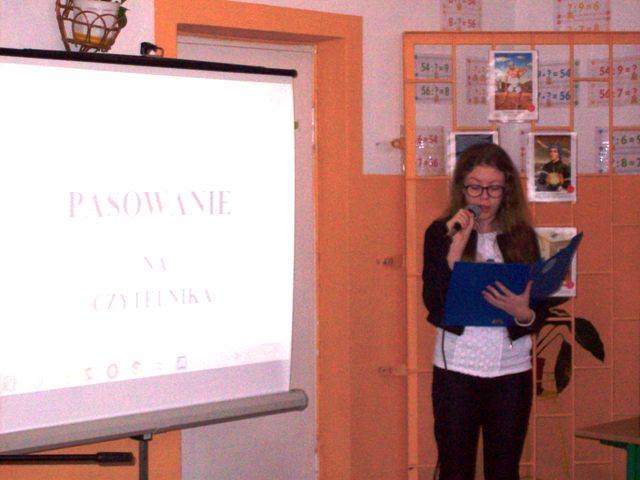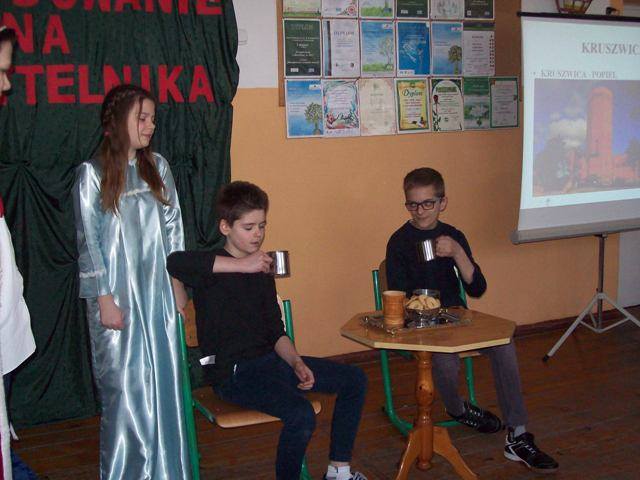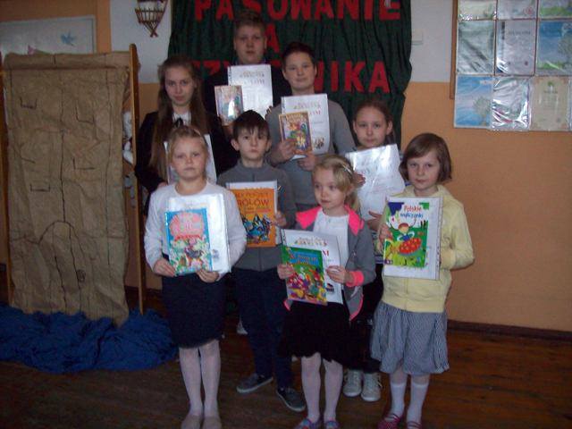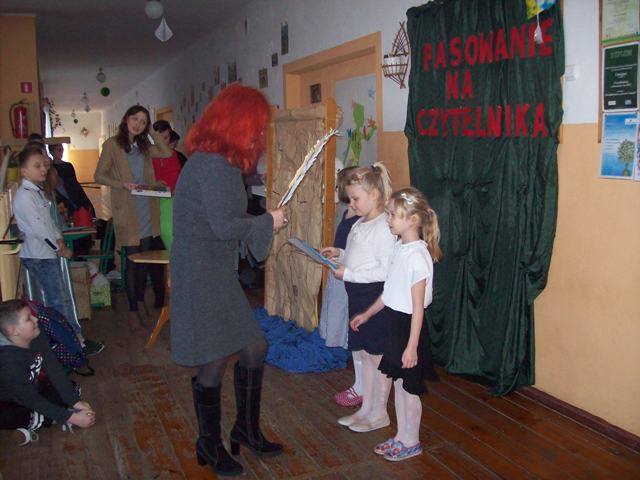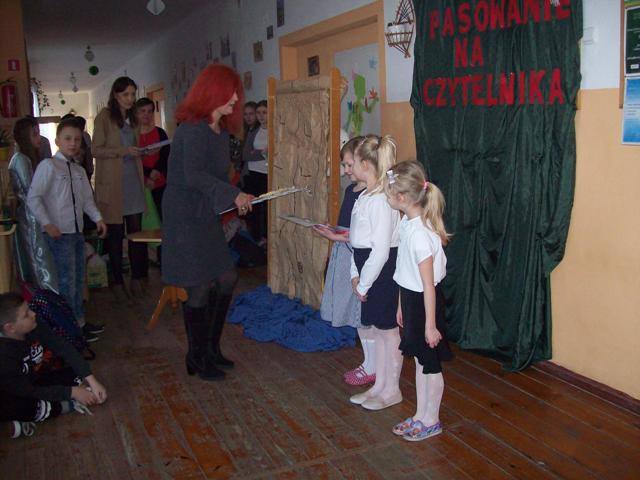 26 marca obchodziliśmy Dzień Teatru połączony z pasowaniem na czytelnika uczniów klasy pierwszej. W związku z obchodami „Roku dla Niepodległej” uczniowie przygotowali prezentacje legend polskich w postaci krótkich form teatralnych, recytację wierszy i opowiadań przybliżających historię naszego kraju. Uczennice klasy VI Oliwia i Patrycja zagrały na gitarze i zaśpiewały balladę „O Lechu, Czechu i Rusie”. Przypomniały wszystkich początki powstania naszego państwa. Kolejną legendą był utwór „Szabla króla Zygmunta”, który wyjaśnia powstanie pomnika Zygmunta III Wazy przed Zamkiem Królewskim w Warszawie. Poza tym w tej opowieści pojawia się również wytłumaczenie dlaczego dłoń króla Zygmunta trzymająca szablę jest uniesiona ku górze. Kacper z klasy VII przeczytał legendę „Jak powstała nazwa Toruń?” Uczniowie klasy V przedstawili legendę o Popielu. Była trucizna, wieża i myszy… Julia i Natalia jako przewodniczki turystyczne w ekspresowym skrócie opowiedziały historię Polski. Puentą ich wypowiedzi było znane powiedzenie: „Cudze chwalicie, swego nie znacie. Sami nie wiecie, co posiadacie”. Przyznamy rację, bo przecież Polska jest bardzo ciekawym krajem. Uczennice klasy pierwszej wyrecytowały wiersz Władysława Bełzy „Katechizm polskiego dziecka”. Złożyły przysięgę, że będą zawsze dbać o wypożyczone książki. Wspaniale poradziły sobie z zagadką. Zadanie polegało na podaniu tytułu legendy lub imion bohaterów na podstawie rekwizytów. Następnie pani dyrektor J. Bojanowska piórem o rozmiarze XXL dokonała aktu pasowania na czytelnika. Życzyła nowym czytelniczkom naszej szkolnej biblioteki wielu niezapomnianych, wspaniałych przygód z książką. Po tej ceremonii nastąpił uroczysty wpis do księgi przez pierwszoklasistki. Na pamiątkę otrzymały dyplomy i książki .