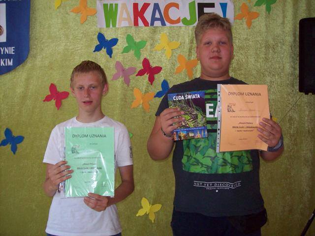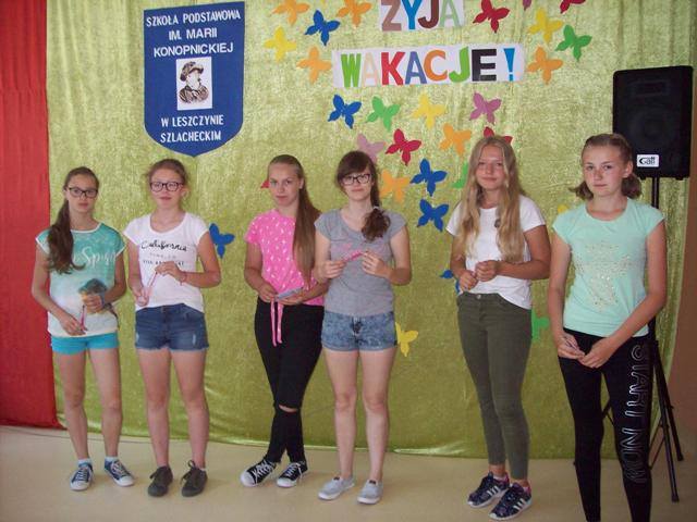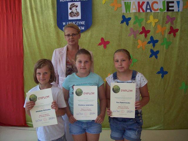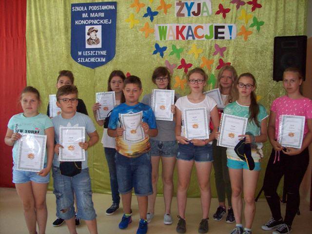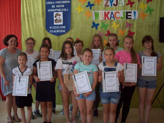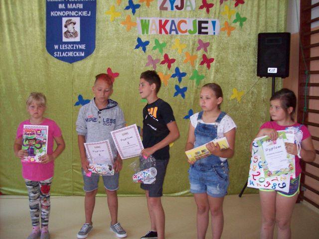 Pani Dyrektor J. Bojanowska wręczyła dyplomy uczniom, którzy w roku szkolnym 2017/2018 aktywnie działali w SKKT PTTK „Piegus”, SKO, szkolnym chórze, uczestniczyli w konkursach szkolnych i pozaszkolnych np. „Mały ekonomista”, „Szkolny Mistrz Ortografii”, „Wzorowa łazienka”, „Droga do świętości św. Stanisław Kostka”, „Matematyczny Kangur”, „Poznajemy Ojcowiznę". Były również dyplomy dla najlepszego matematyka w szkole, szkolnego społecznika, za działalność charytatywną. Za 100% frekwencję dyplomy otrzymały: Patrycja Barucha, Ola Spadło i Oliwka Trzcińska.