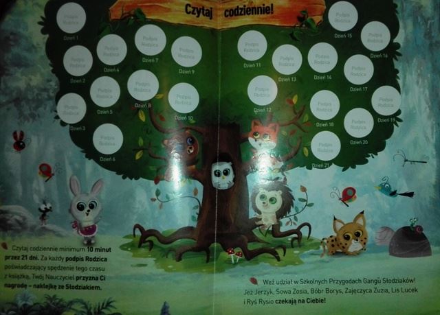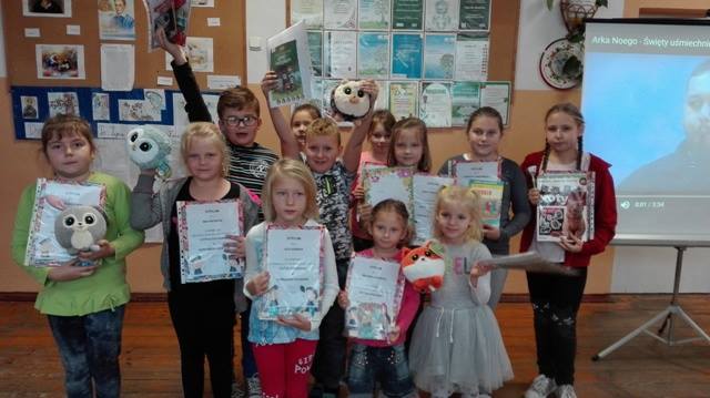 Przedszkolaki i uczniowie klas I-IV uczestniczyli w szkolnym konkursie „Czytaj codziennie”. Pomysłodawcą akcji i fundatorem nagród w konkursie była sieć sklepów Biedronka oraz nasza szkoła. W domu dzieci przez 21 dni (codziennie minimum 10 minut) czytały głośno wybraną przez siebie książkę. Za każdy podpis rodzica poświadczający spędzenie tego czasu z książką nauczyciel przyznawał nagrodę – naklejkę ze Słodziakiem, którą dzieci przyklejały do swoich albumów. Konkurs cieszył się bardzo dużym powodzeniem ponieważ wyłoniliśmy aż 7 laureatów (100% naklejek) i 6 uczestników z drugą lokatą. Uczestnicy zostali obdarowani dyplomami, pluszakami – Słodziakami, książkami i drobnymi upominkami. Cieszy nas zaangażowanie dzieci i rodziców. Gratulujemy wszystkim uczestnikom.
