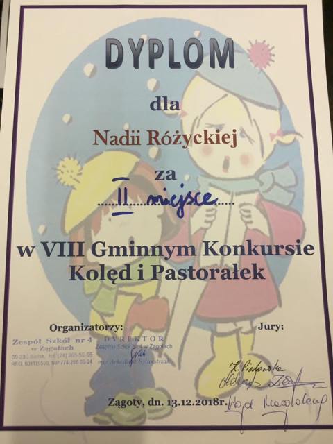 Nadia Różycka i Patrycja Barucha reprezentowały naszą szkołę w VIII Gminnym Konkursie Kolęd i Pastorałek zorganizowanym przez SP w Zągotach. Nadia zaśpiewała piosenkę „Kochany Panie Mikołaju” i zajęła II miejsce w kategorii klas I-III, natomiast Patrycja wykonała piosenkę „Mario czy ty wiesz” zajmując III miejsce w kategorii klas IV-VIII. Gratulujemy!