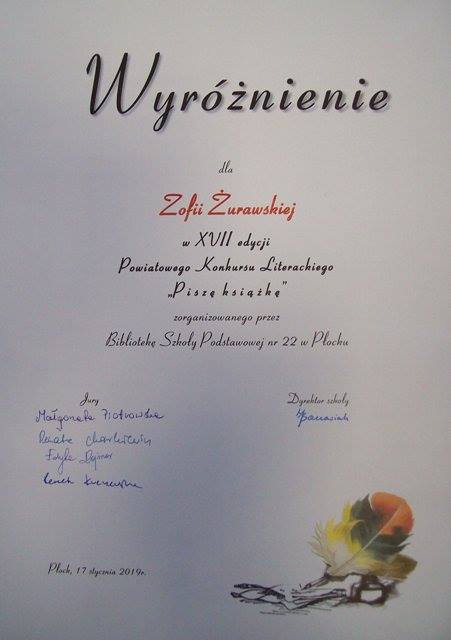 Uczennica klasy IV Zosia Żurawska zdobyła wyróżnienie w XVII Powiatowym Konkursie Literackim „Piszę Książkę” za pracę pt. „Moje Dwie Ojczyzny”. Konkurs został zorganizowany przez Bibliotekę Szkoły Podstawowej nr 22 w Płocku. Gratulujemy!