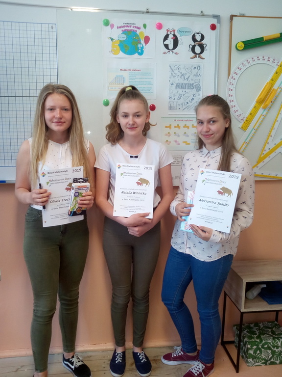 Nasza szkoła wzięła udział w obchodach Ogólnopolskiego Dnia Matematyki, którego inicjatorem jest Stowarzyszenia Doskonalenia i Rozwoju 4improve. W tym roku hasłem przewodnim była „Matematyka dzika”, a więc zadania, pytania związane (luźno) z dziką przyrodą w Polsce. Począwszy od 12 marca podczas przerw można było rozwiązywać zadania matematyczne, łamigłówki, krzyżówki, rebusy. Uczniowie każdego dnia zdobywali cenne punkty i sprawdzali, kto prowadzi w ogólnej klasyfikacji. Wielki finał miał miejsce 27 marca i polegał na rozwiązaniu zadań, które były udostępnione w postaci interaktywnej prezentacji zawierającej 24 pytania. Wszyscy finaliści na koniec losowali mini nagrody (gry, przybory geometryczne, długopisy, notatniki, książki itp.). Po podsumowaniu wszystkich wyników okazało się, że szkolnym mistrzem matematyki została Ola Spadło (kl. VII), a wicemistrzem Oliwia Trzcińska (kl. VII). Na III miejscu uplasowała się Natalia Winnicka z kl. VII.