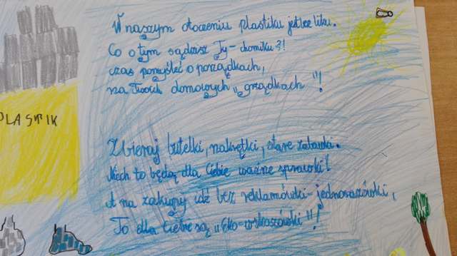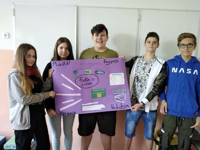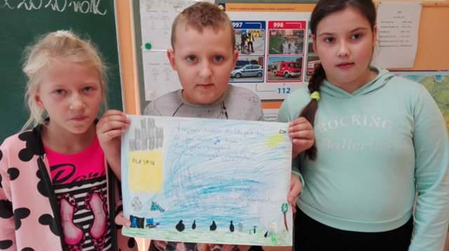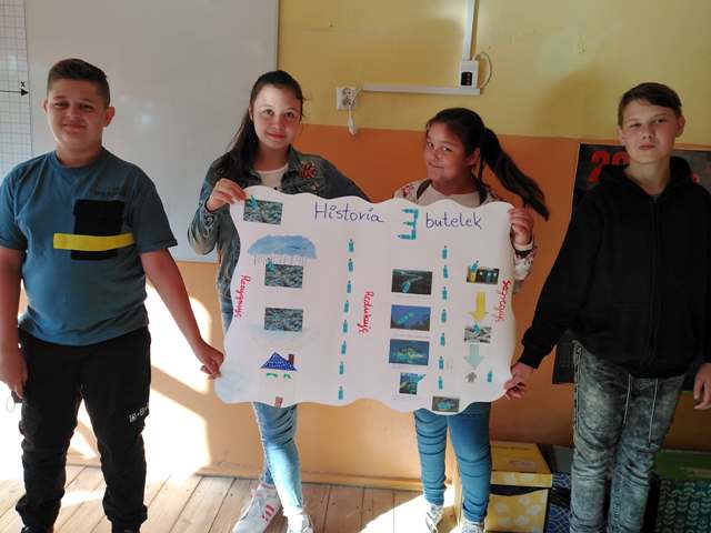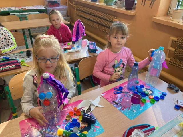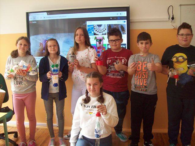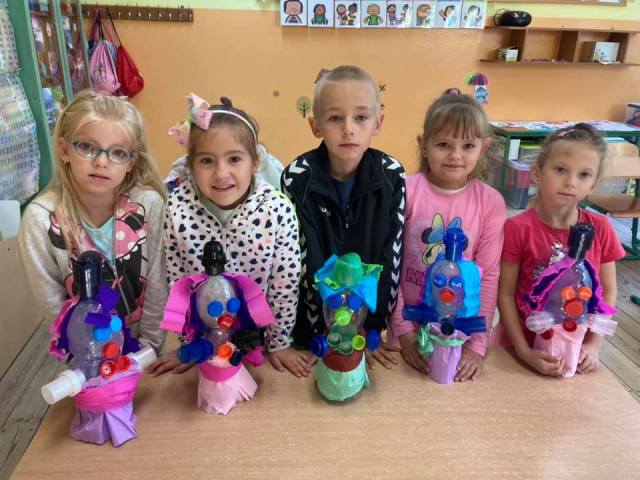 Przedszkolaczki wykonały śmieszne misie z wykorzystaniem płyt CD, kl. I wykonała laleczki z butelek, nakrętek, kl. II i III napisała wiersz, kl. IV i V rozwiązywała zadania na matematyce, kl. VI na technice dawała drugie życie plastikom, kl. VII przedstawiła historię trzech butelek, a kl. VIII przedstawiła plastik w liczbach.