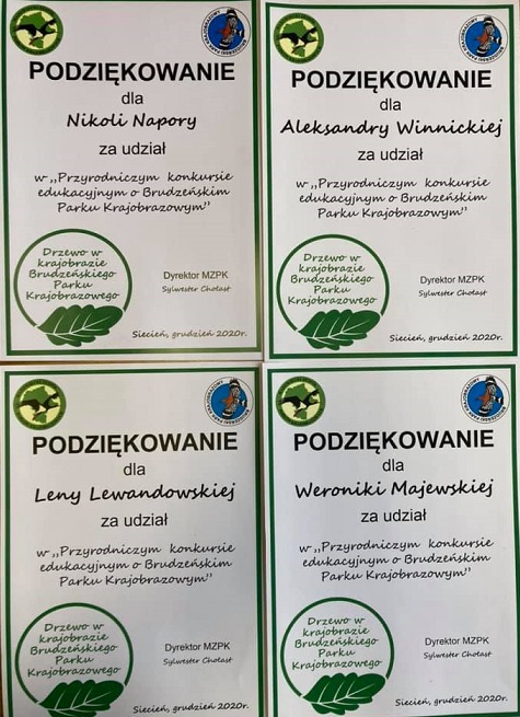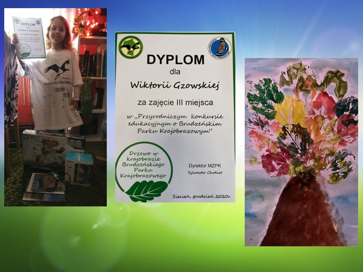 Wiktoria Gzowska uczennica kl. I zajęła III miejsce w konkursie plastycznym "Drzewo w krajobrazie Brudzeńskiego Parku Krajobrazowego”. Celem konkursu było rozbudzenie świadomości ekologicznej, inspirowanie dzieci do poznawania najbliższej okolicy, a także walorów przyrodniczych i historycznych Brudzeńskiego Parku Krajobrazowego.